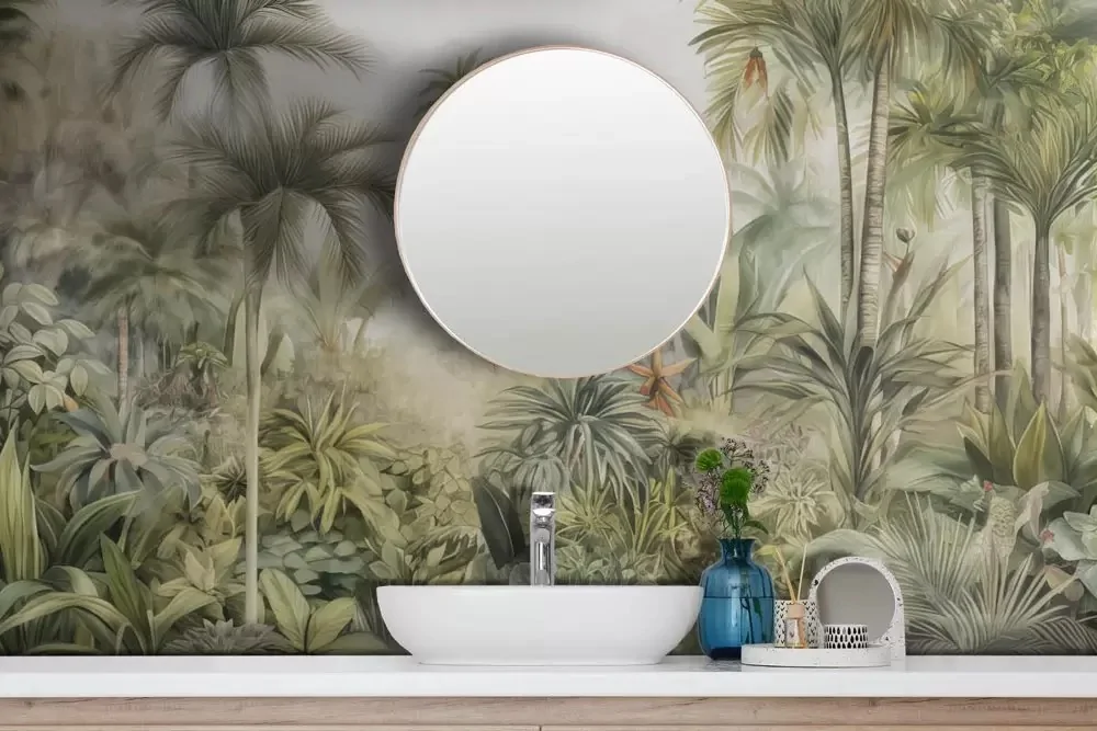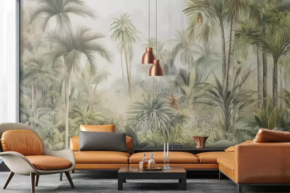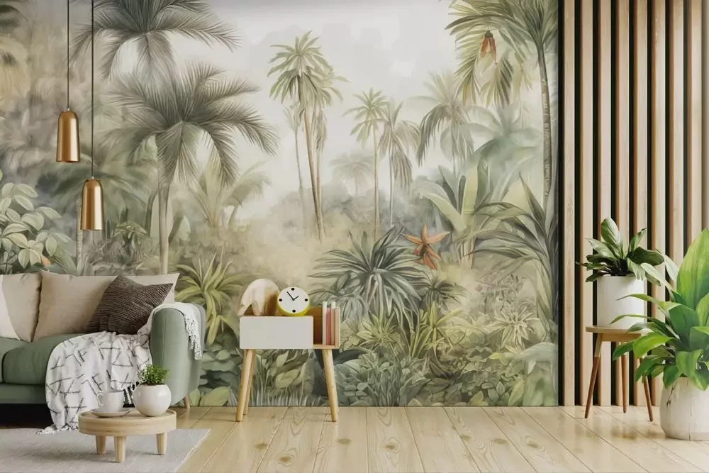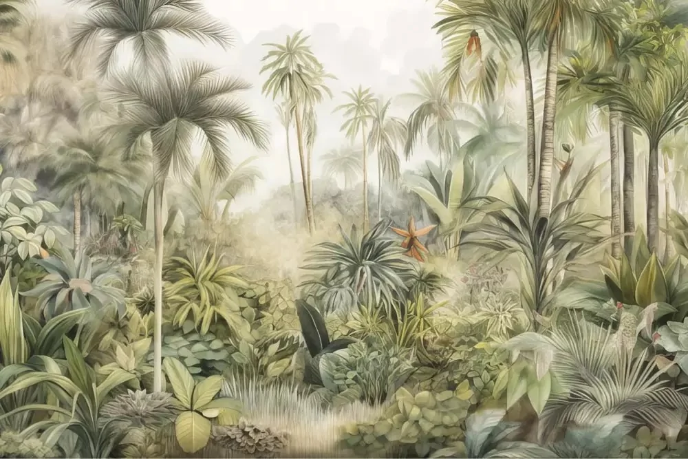 Carta da parati paesaggio giungla tropicale vintage, sofisticata e chic. Ideale per zone giorno luminose. Realizzata con materiali sostenibili.
