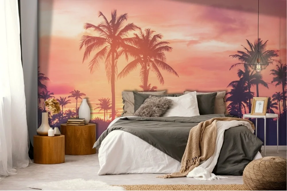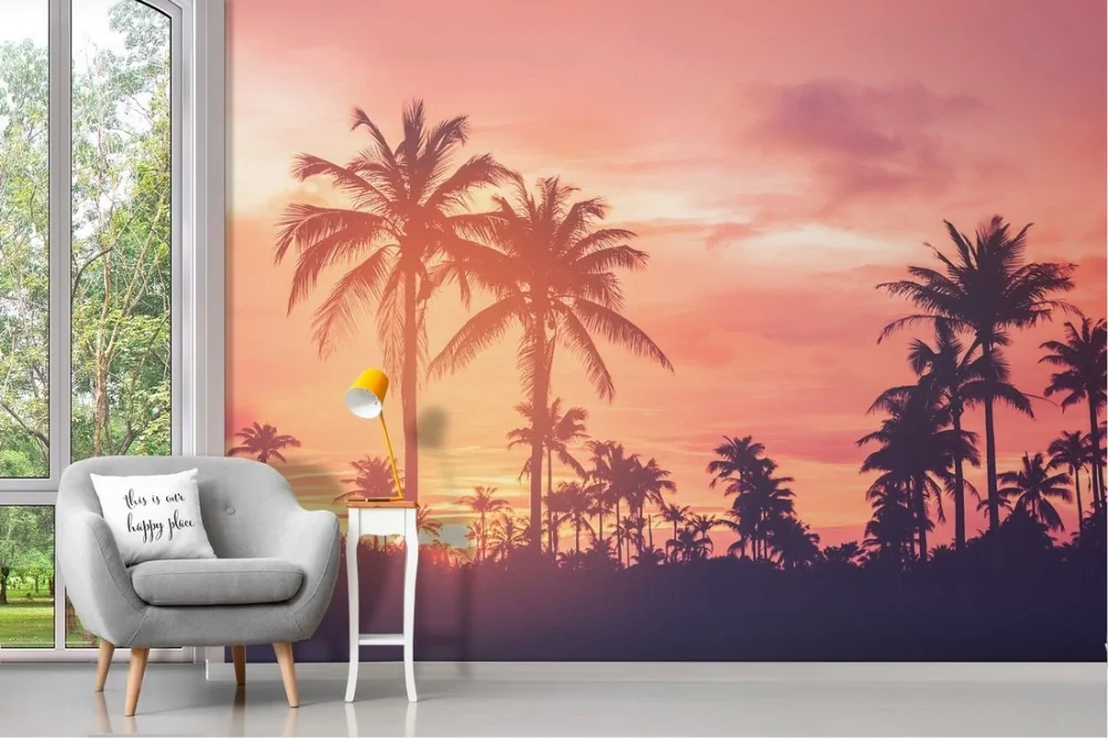 Tropical landscape wallpaper with palm trees at sunset dawn