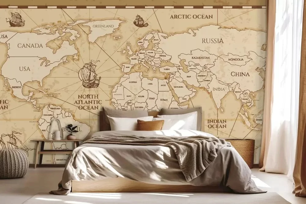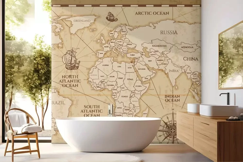 Carta da parati mappamondo antico vintage, delicata e armoniosa. Ideale per studi e home office. Ecologica e personalizzabile.