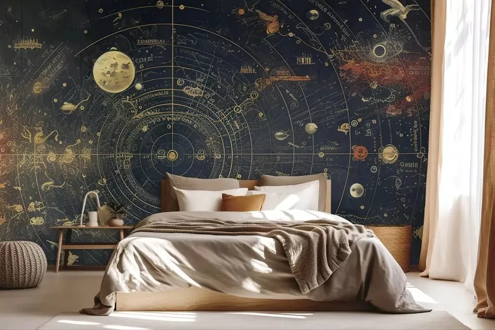Carta da parati mappa galassia stilizzata, morbida e rilassante. Ideale per ambienti moderni. Realizzata con materiali sostenibili.