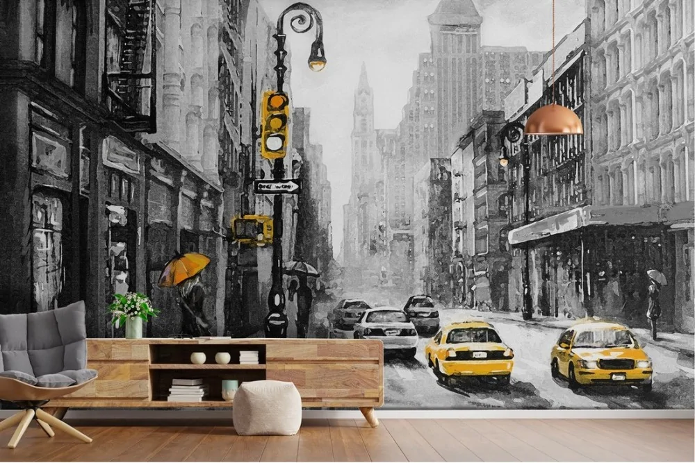 New York City Taxi Modern Painted Wallpaper