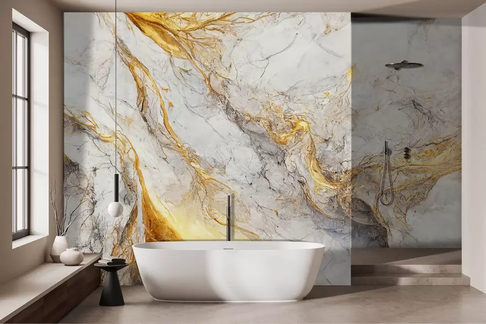 Carta da parati marmo oro luxury, delicata e armoniosa. Ideale per soggiorni eleganti. Ecologica e personalizzabile.