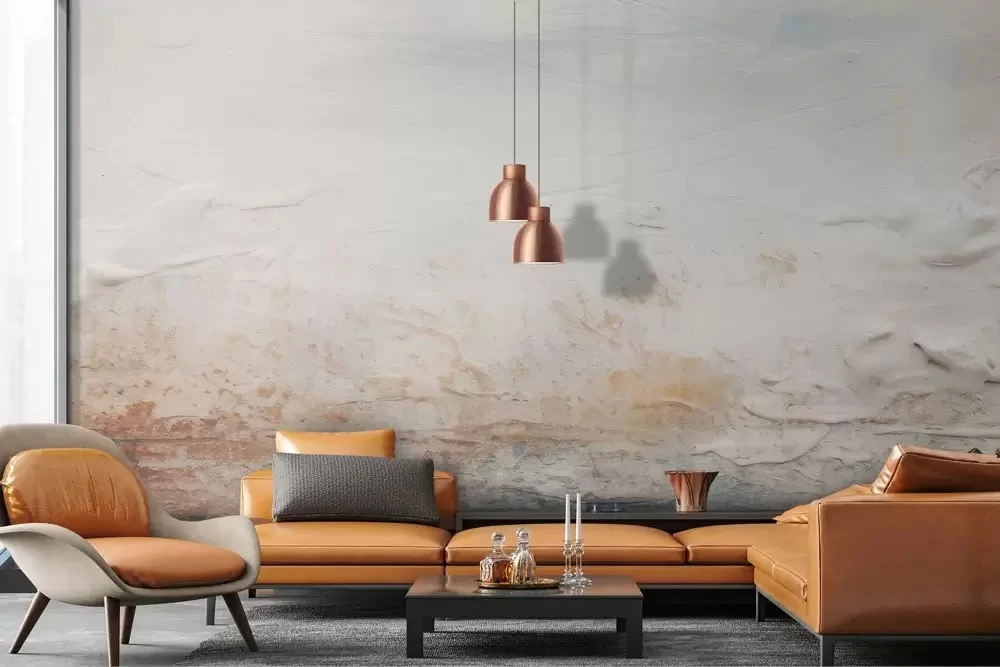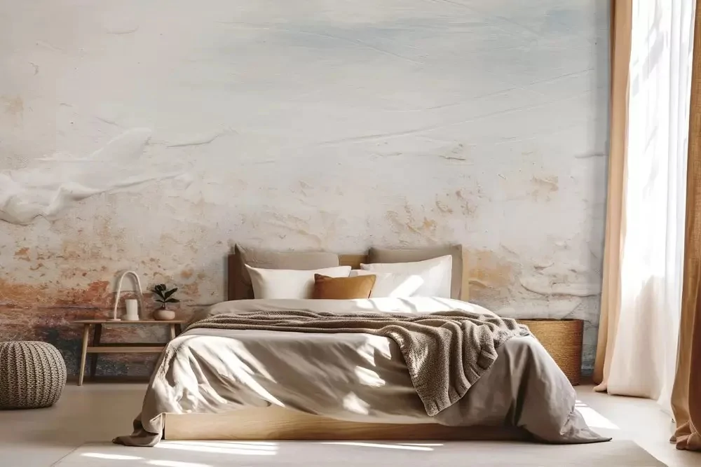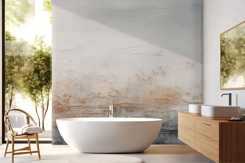 Carta da parati effetto intonaco astratto, delicata e armoniosa. Ideale per ambienti moderni. Ecologica e personalizzabile.