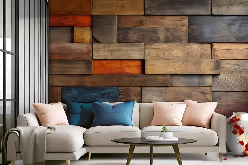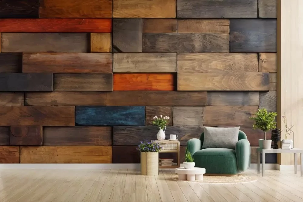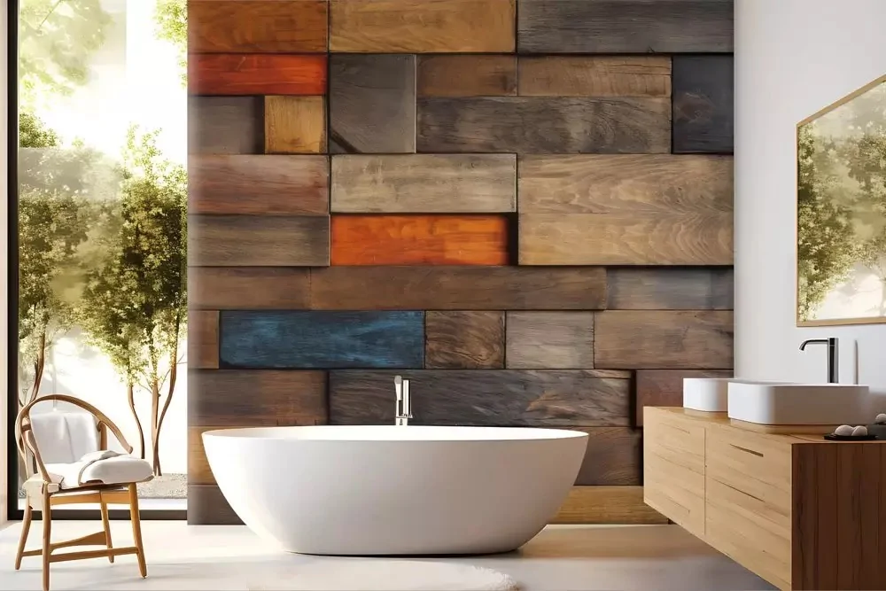 Carta da parati mosaico tasselli in legno 3d, sofisticata e chic. Ideale per ambienti moderni. Realizzata con materiali sostenibili.