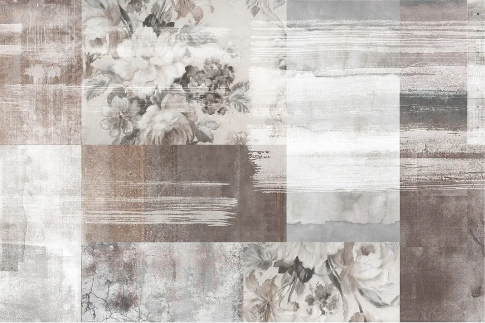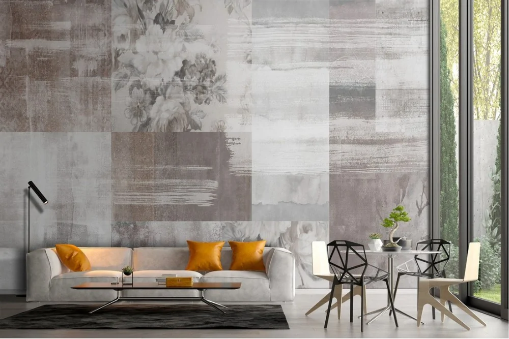 Cement surface wallpaper with painted flowers