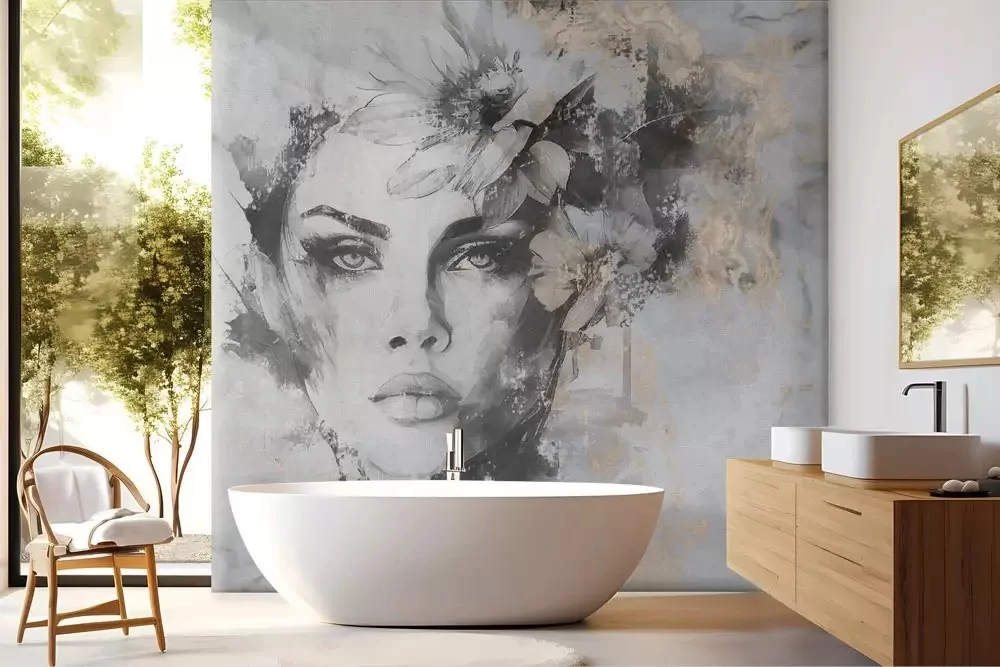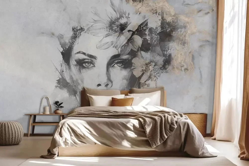 Carta da parati ritratto volto artistico, scenografica e di carattere. Ideale per salotti e studi creativi. Personalizzabile su misura.