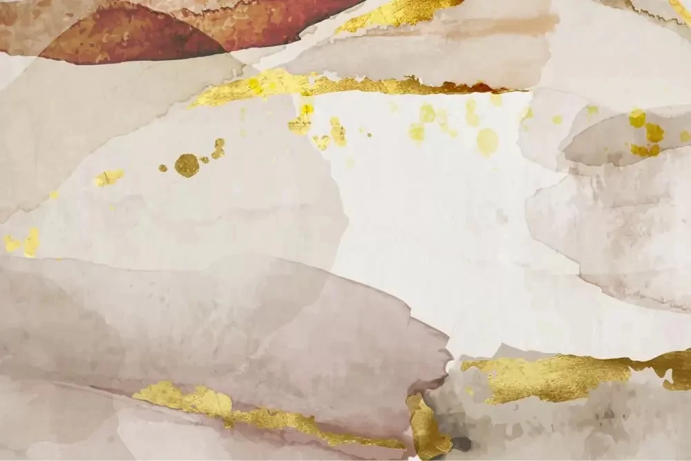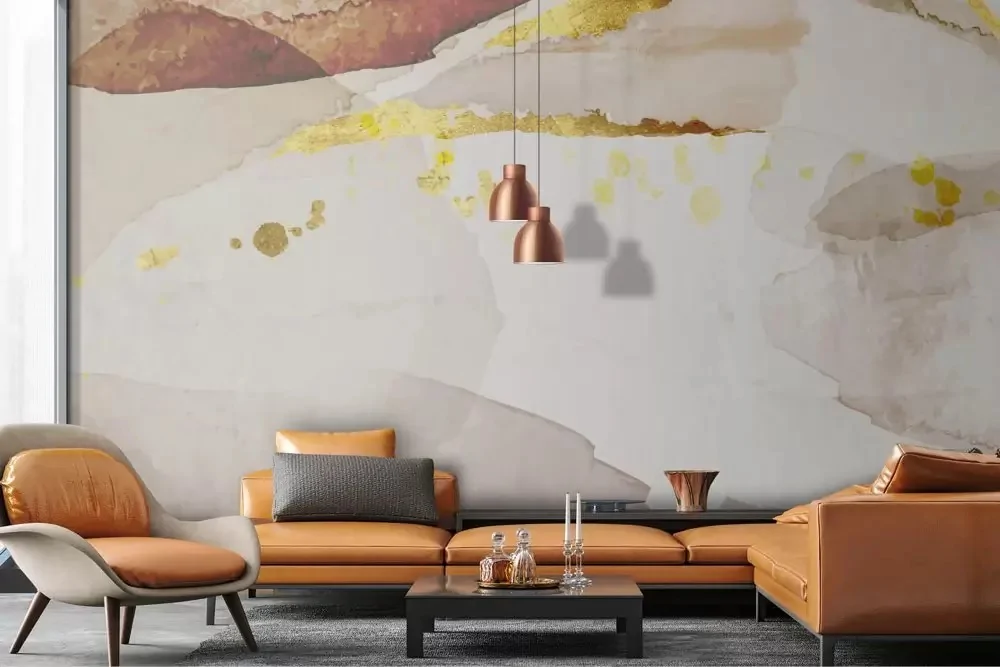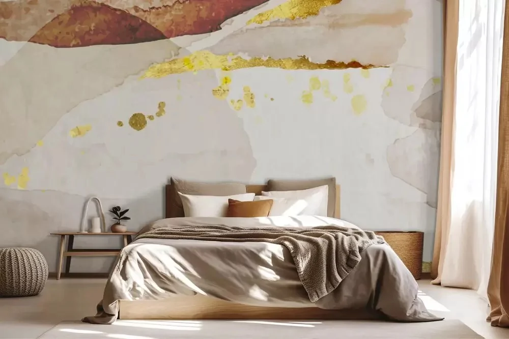 Carta da parati sfumature terra con dettagli oro, vivace e naturale. Ideale per soggiorni eleganti. Ecologica e personalizzabile.