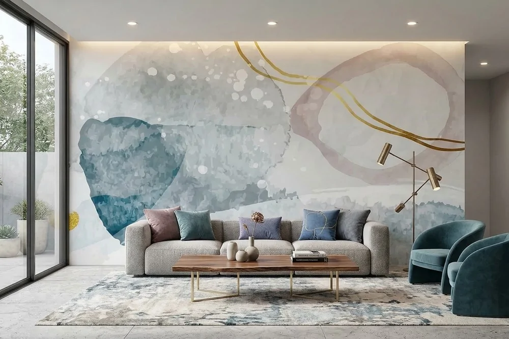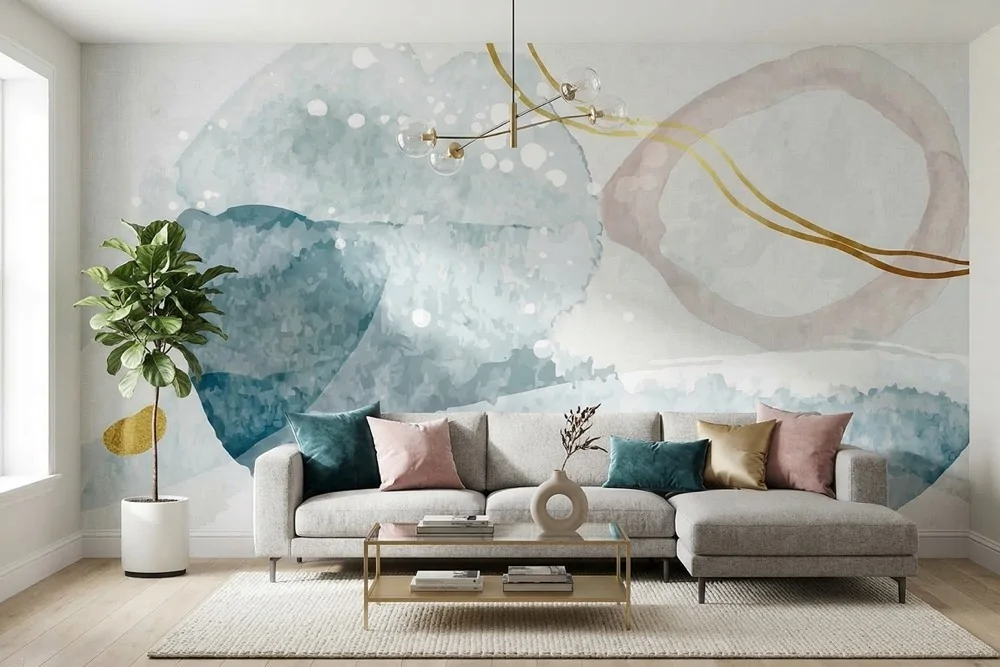 Carta da parati astratta acquerello blu e dettagli oro, scenografica e di carattere. Ideale per soggiorni eleganti. Personalizzabile su misura.
