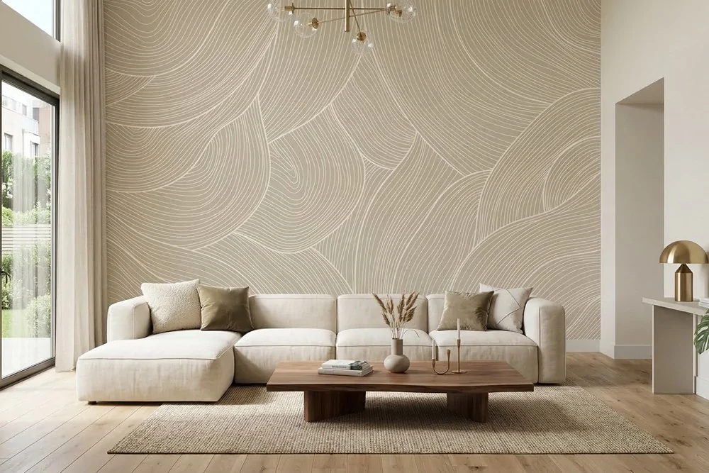 Carta da parati motivo ondulato astratto fondo beige, elegante e luminosa. Ideale per ambienti moderni. Artigianale italiana.