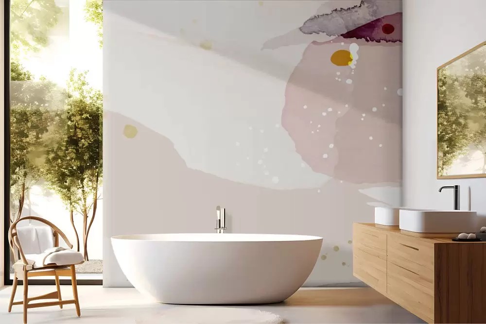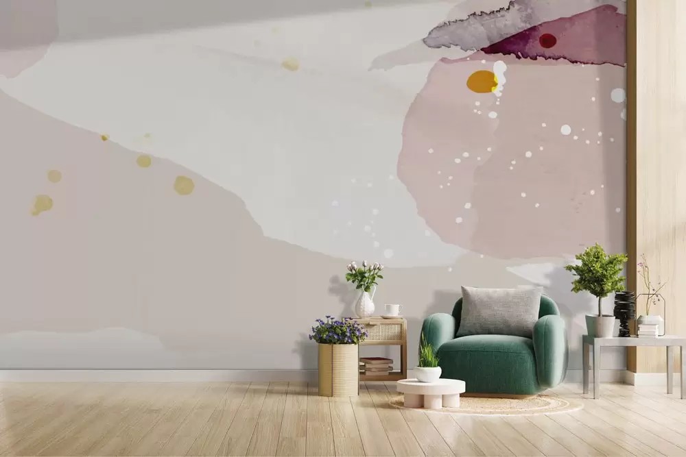 Carta da parati astratta rosa acquerello, materica e avvolgente. Ideale per ambienti moderni. Inchiostri a base d’acqua, atossici.