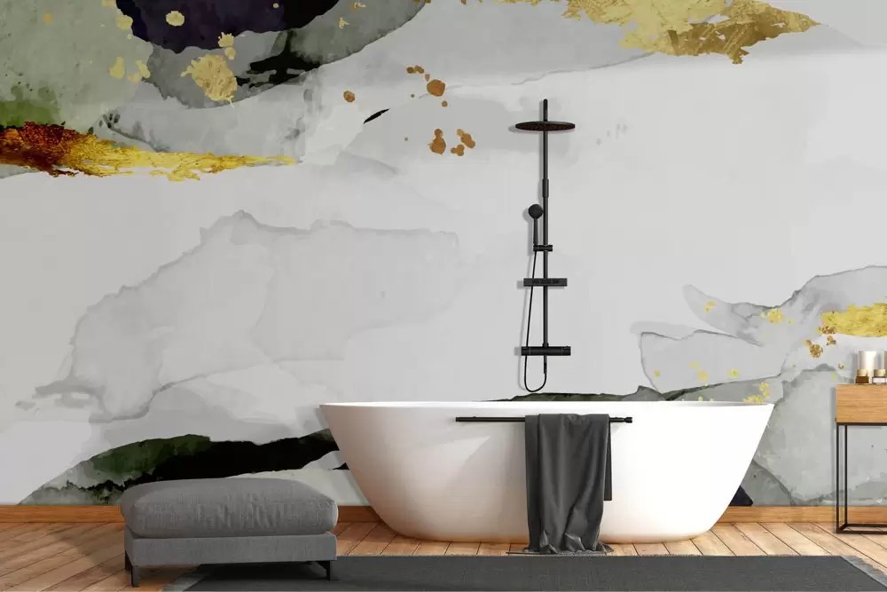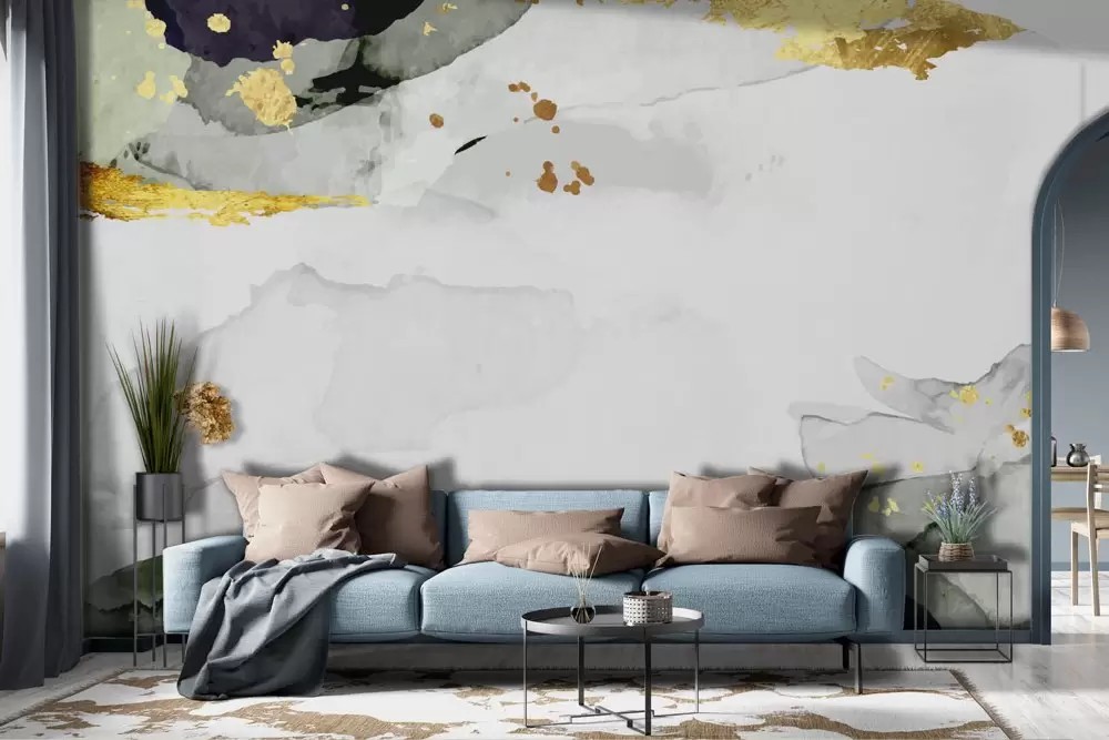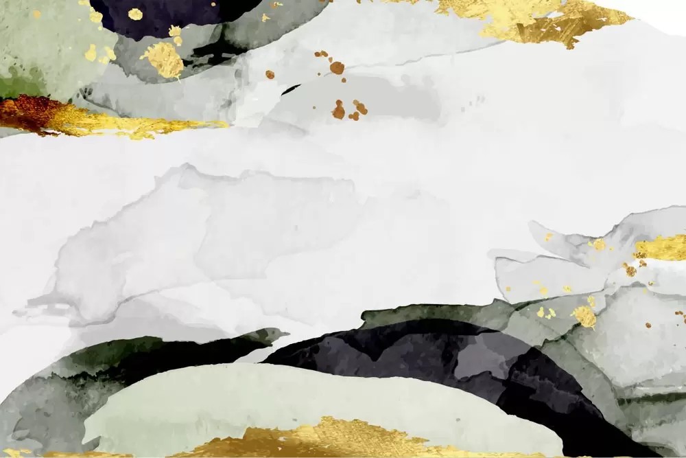 Carta da parati astratta tonalità nero e oro, vivace e naturale. Ideale per soggiorni eleganti. Ecologica e personalizzabile.