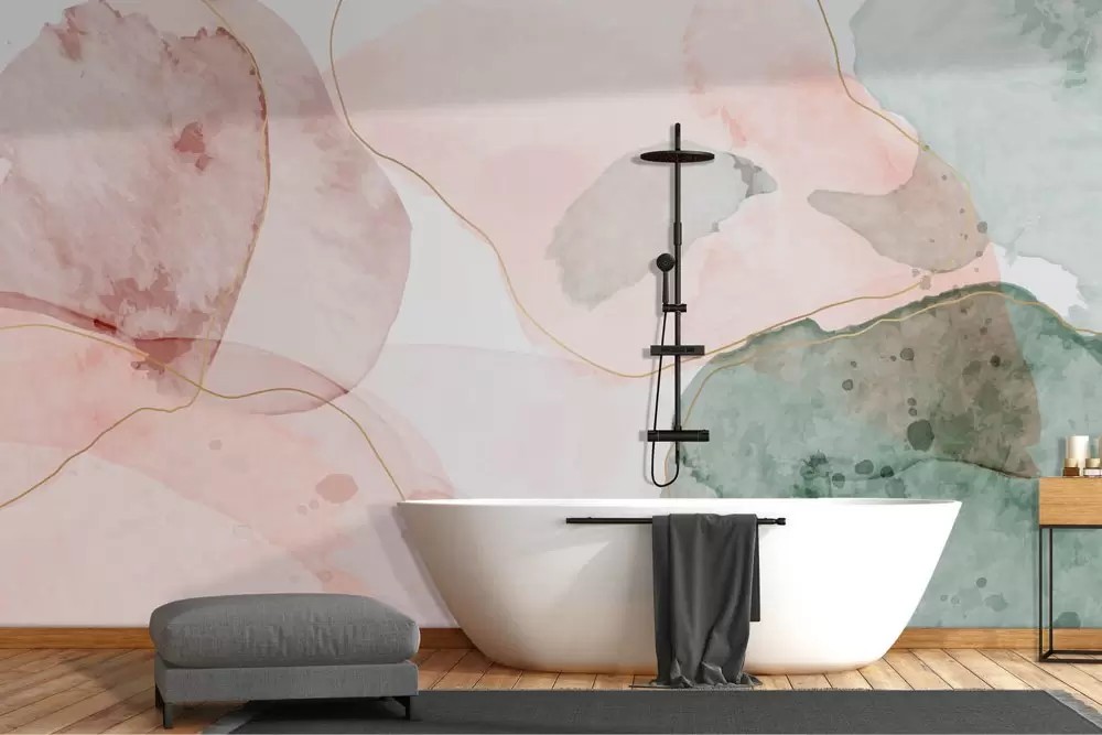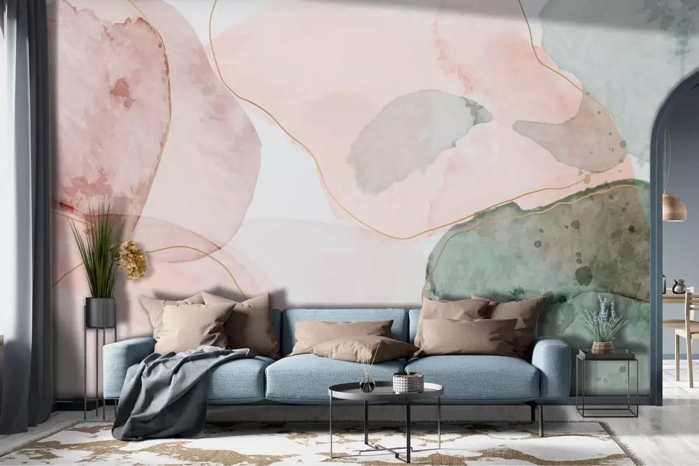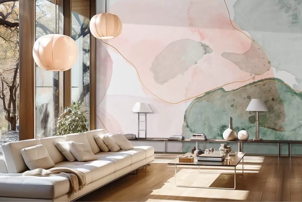 Carta da parati astratta acquerello pastello, sofisticata e chic. Ideale per ambienti moderni. Realizzata con materiali sostenibili.