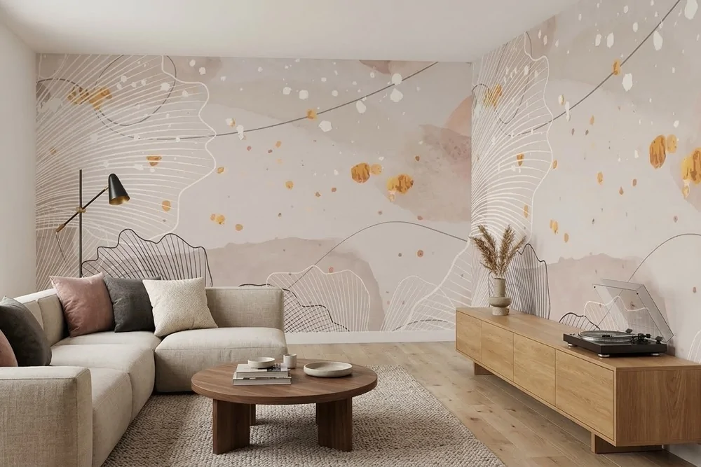 Carta da parati stilizzata astratta, morbida e rilassante. Ideale per ambienti moderni. Realizzata con materiali sostenibili.