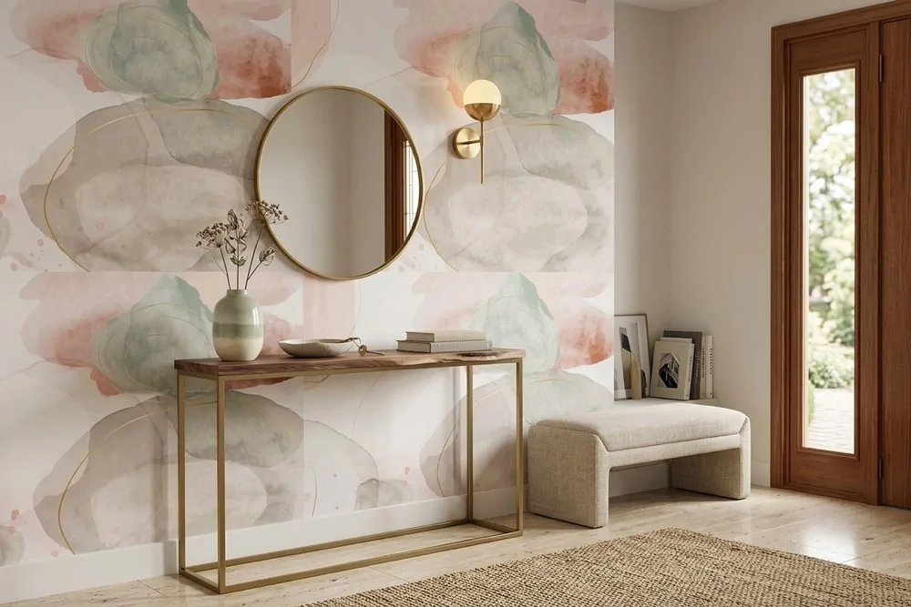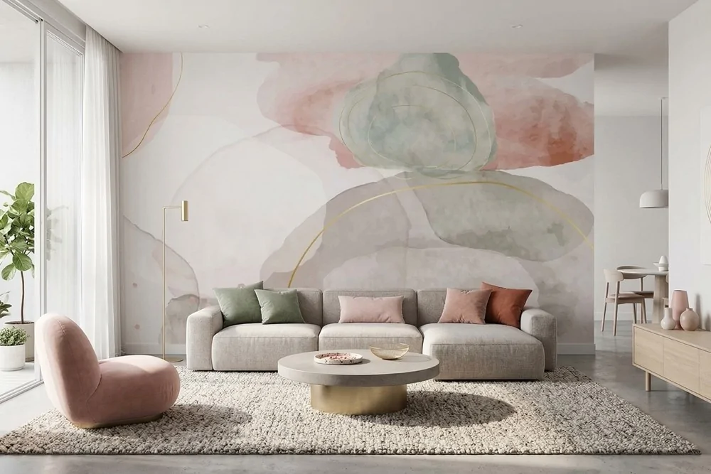 Carta da parati sfumature astratte pastello, materica e avvolgente. Ideale per ambienti moderni. Inchiostri a base d’acqua, atossici.