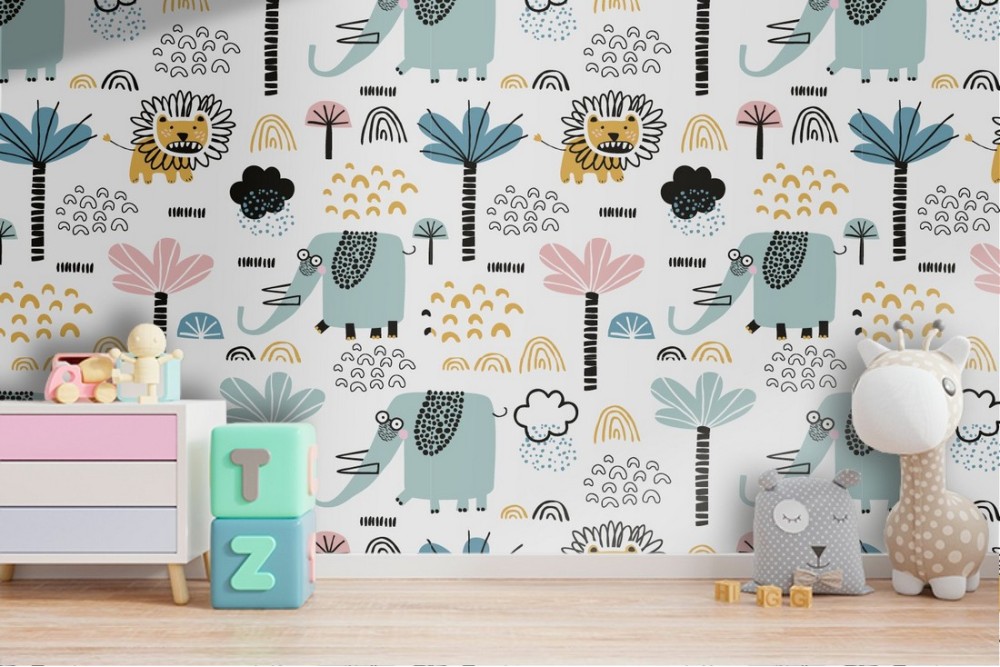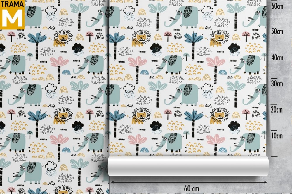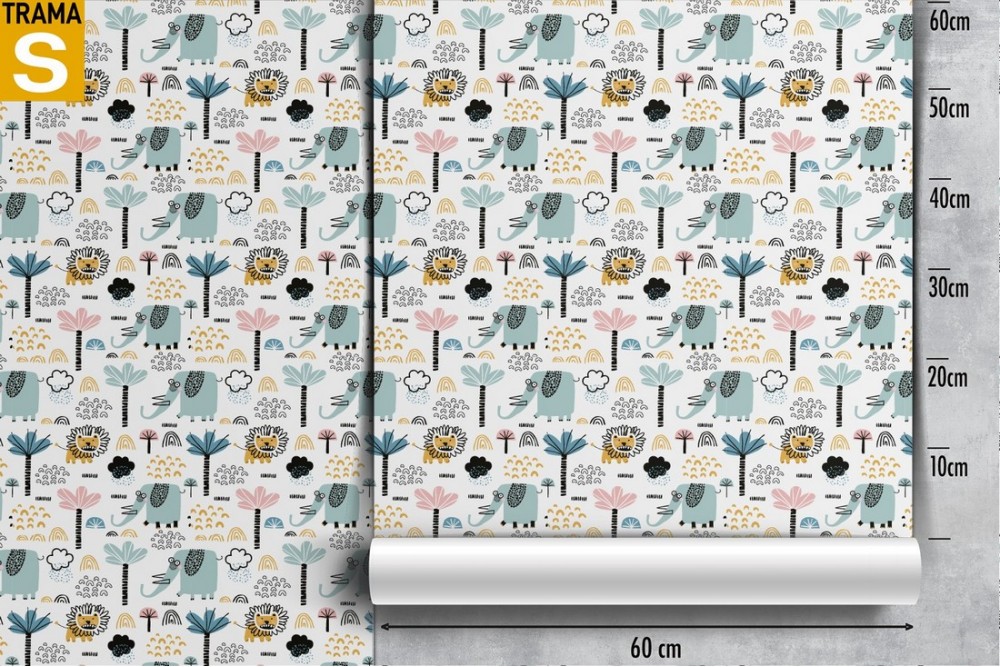 Carta da Parati animali leoni elefanti stilizzati bambini.