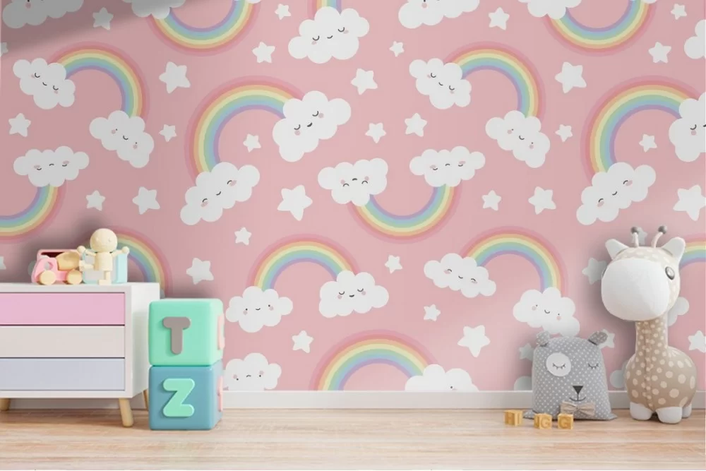 Carta da Parati arcobaleno e nuvole decorazione bambini.