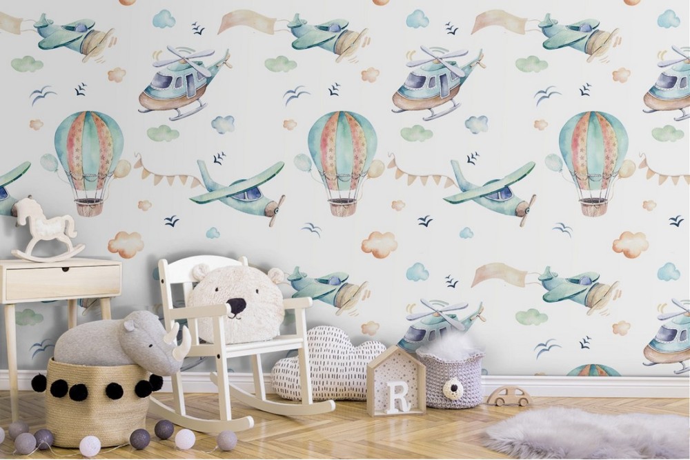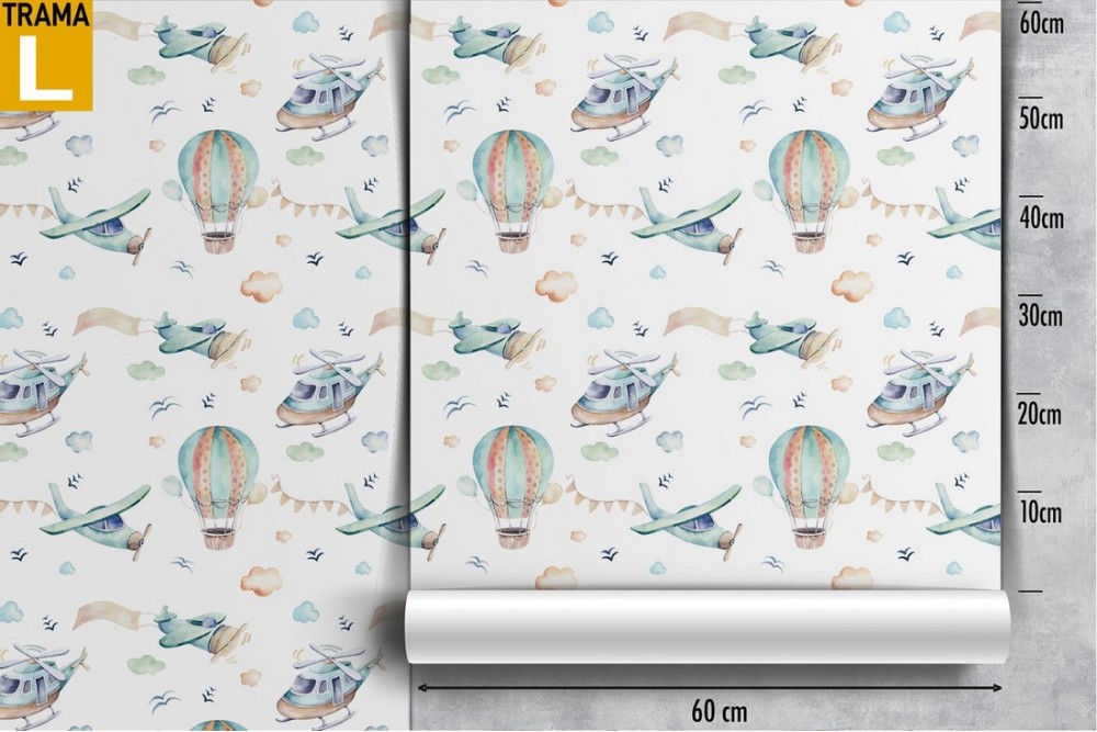 Carta da Parati aerei e mongolfiere bambini pattern.