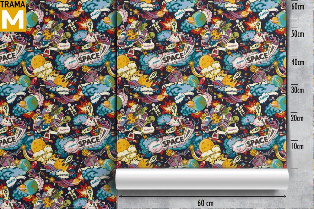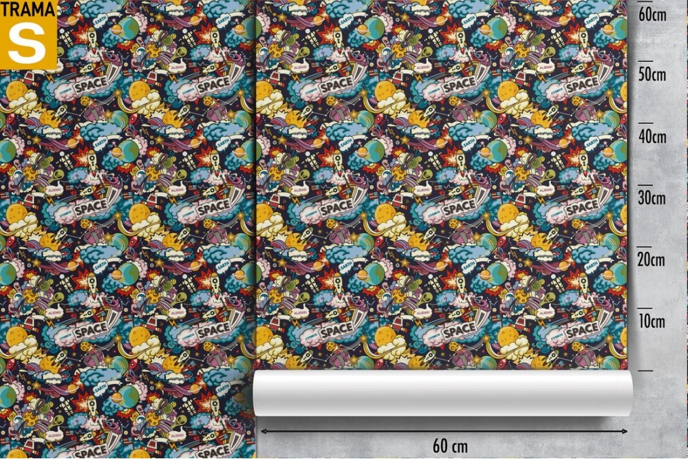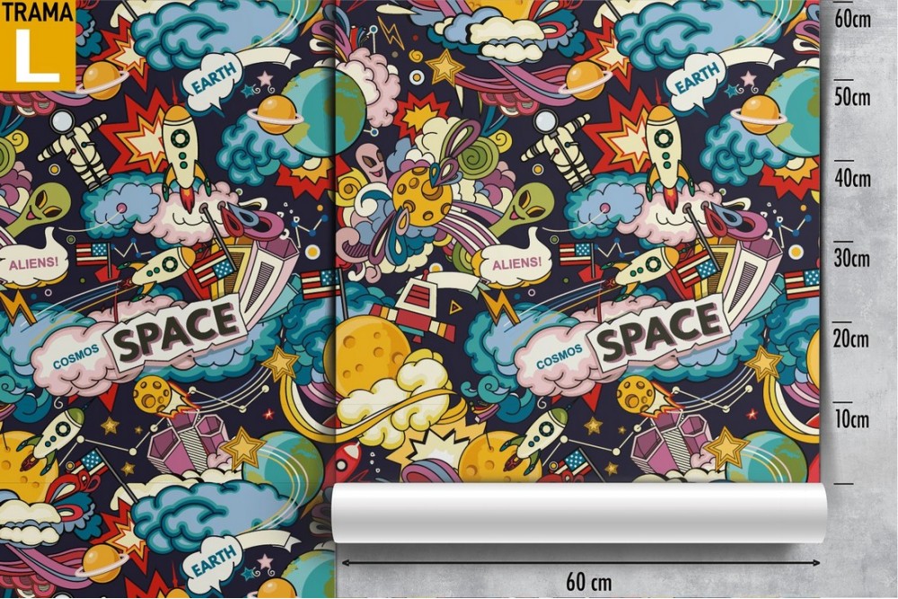 Carta da Parati razzi e scritte spazio bambini pattern.