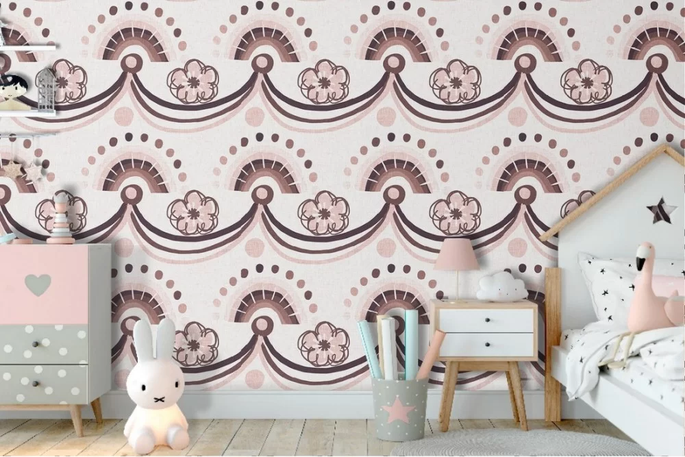 Carta da Parati fiori e arcobaleni rosa cameretta bambini.