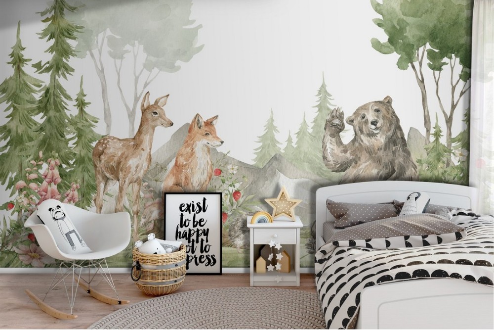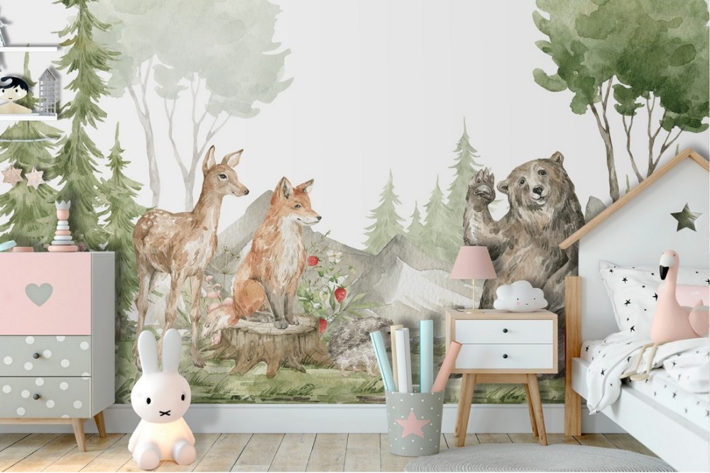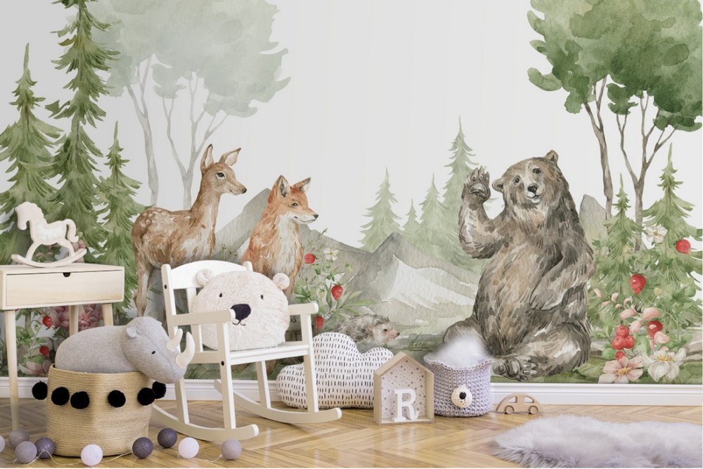 Carta da Parati illustrazione bambini animali bosco cameretta-17