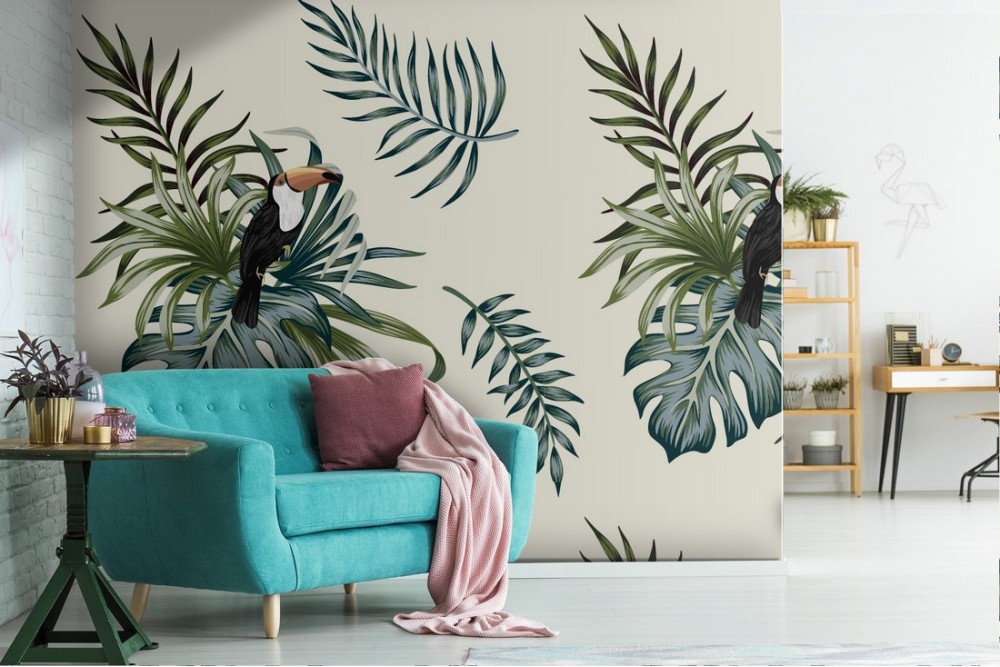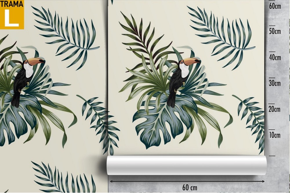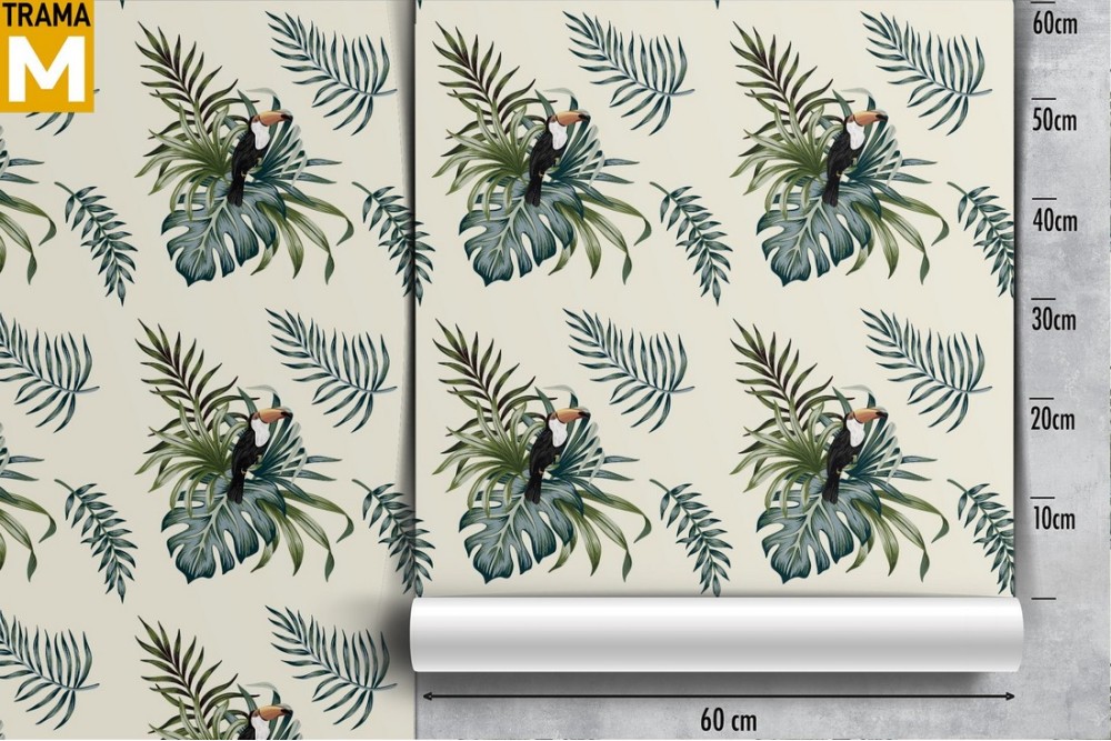 Carta da Parati foglie tropicali e tucano natura pattern.