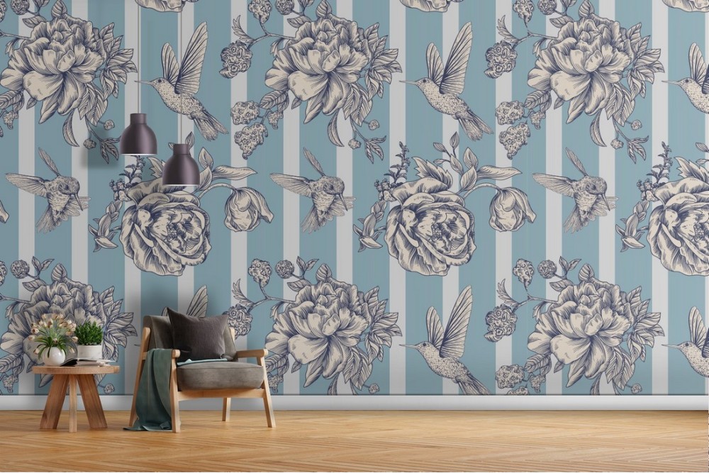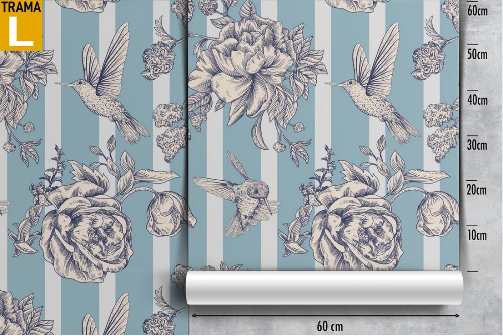 Carta da Parati decorazione rose vintage e righe azzurre.