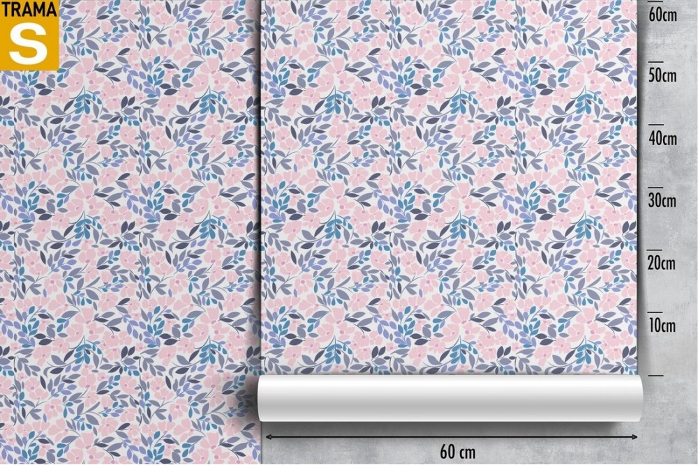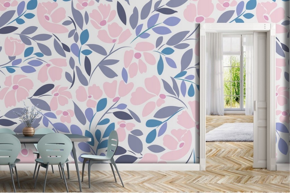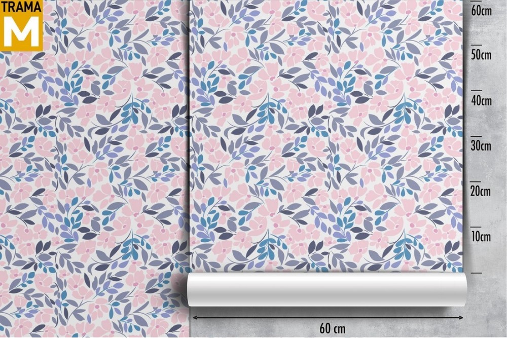 Carta da Parati foglie stilizzate rosa e azzurro pattern.