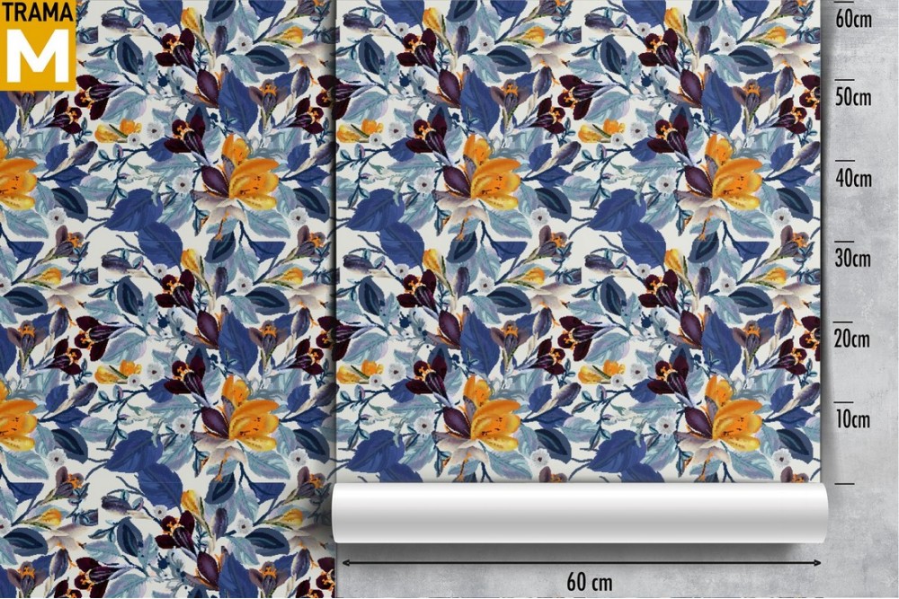 Carta da Parati foglie azzurro e fiori arancione natura.