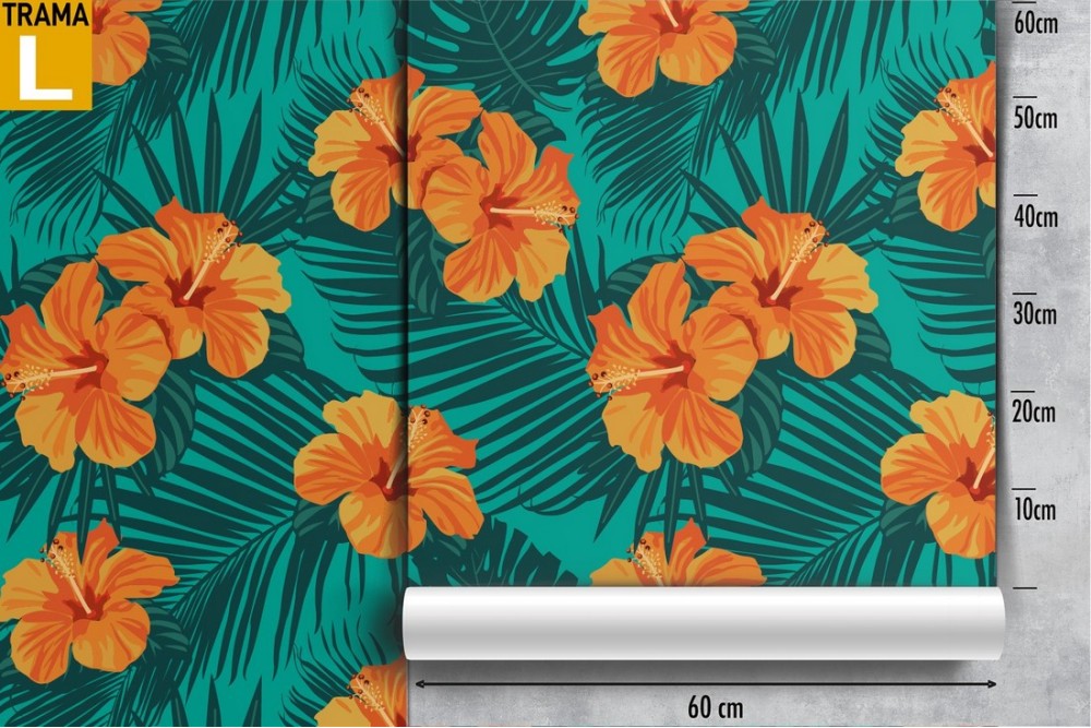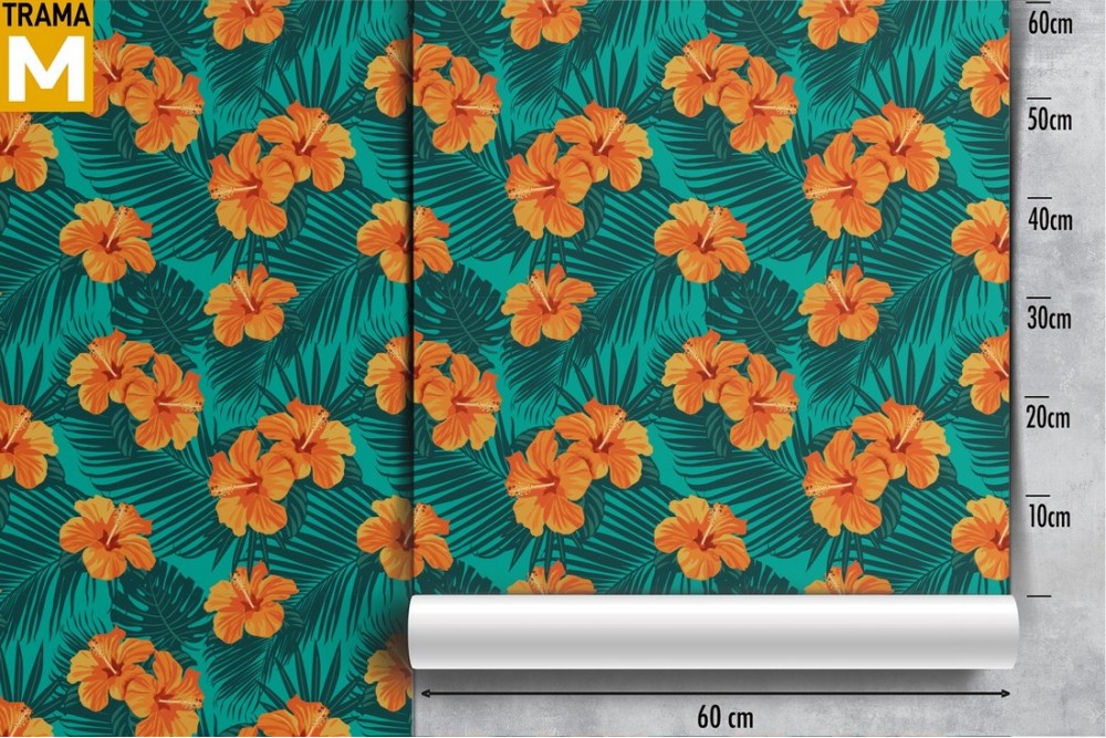 Carta da Parati fiori e foglie tropicali arancione.