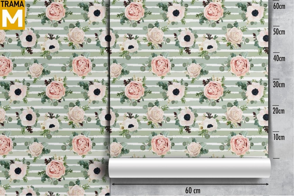 Carta da Parati fiori design vintage rosa e bianco righe verdi.
