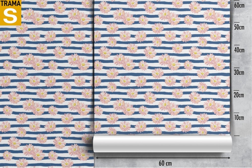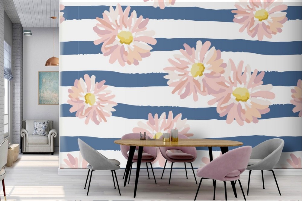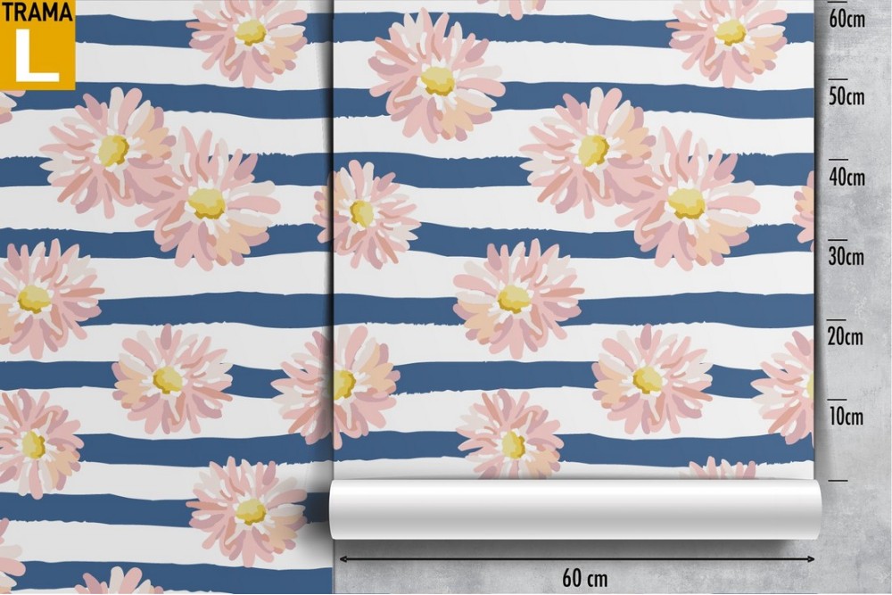Carta da Parati fiori bianchi e righe blu pattern moderno.