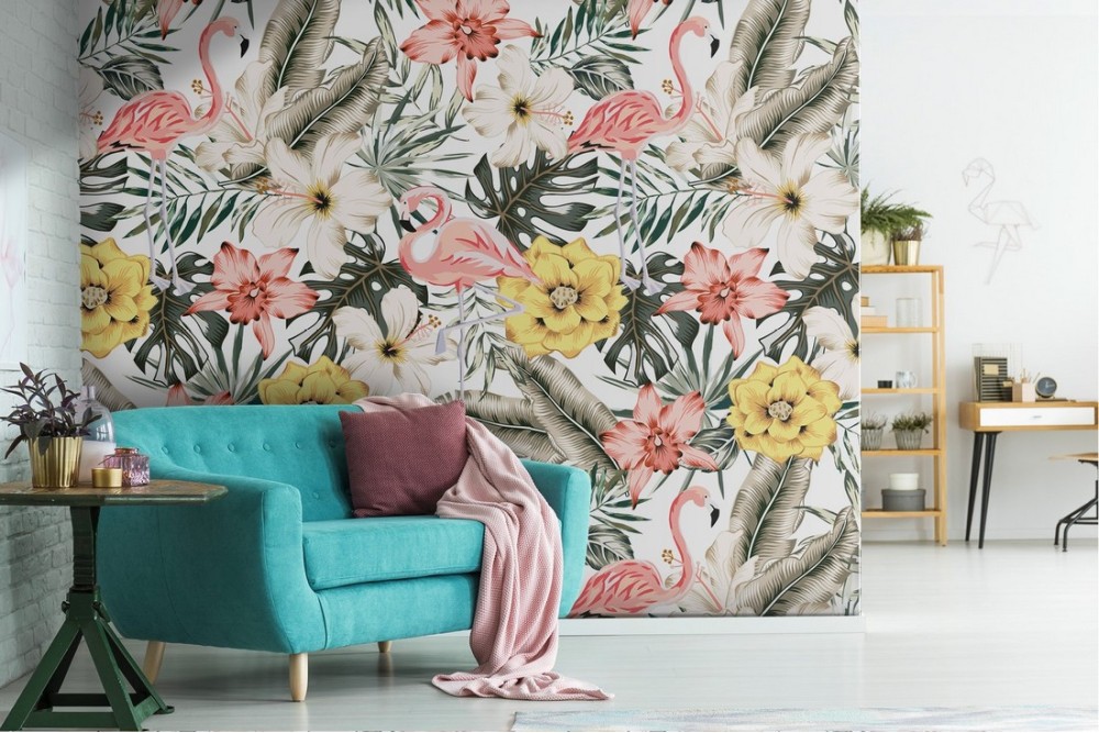 Carta da Parati fiori foglie e animali tropicali pattern vintage.