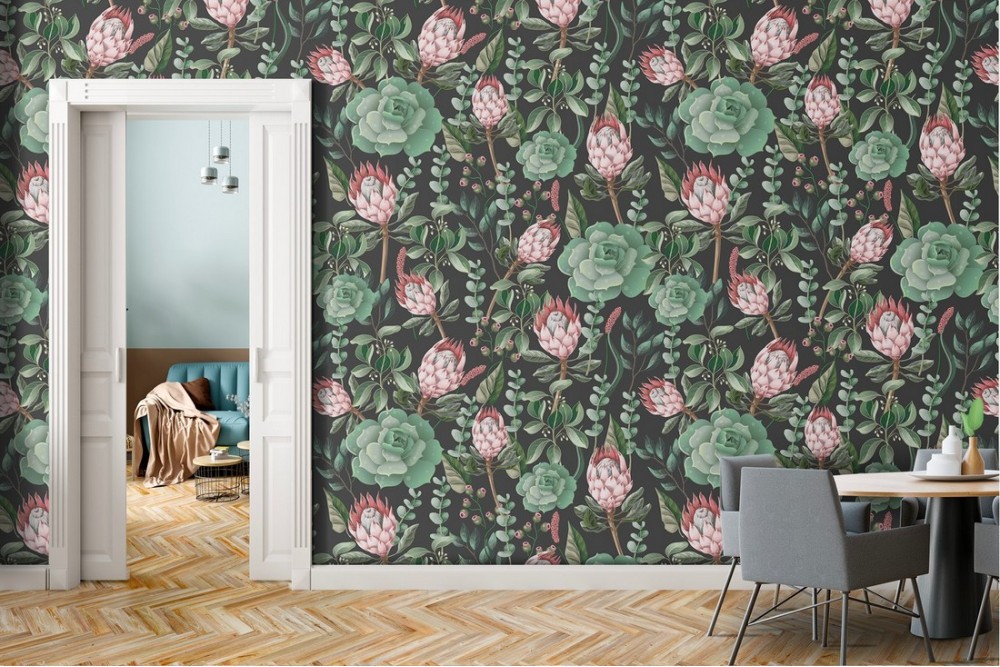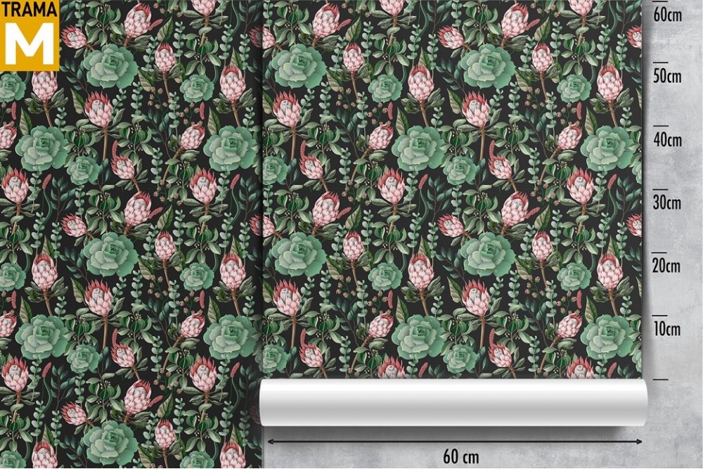 Carta da Parati fiori rosa e foglie verdi natura vintage.