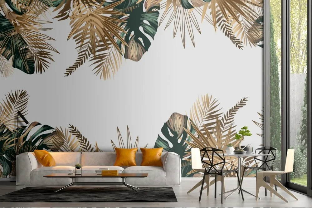 Carta da Parati foglie tropicali verdi e oro decorazione dettagli