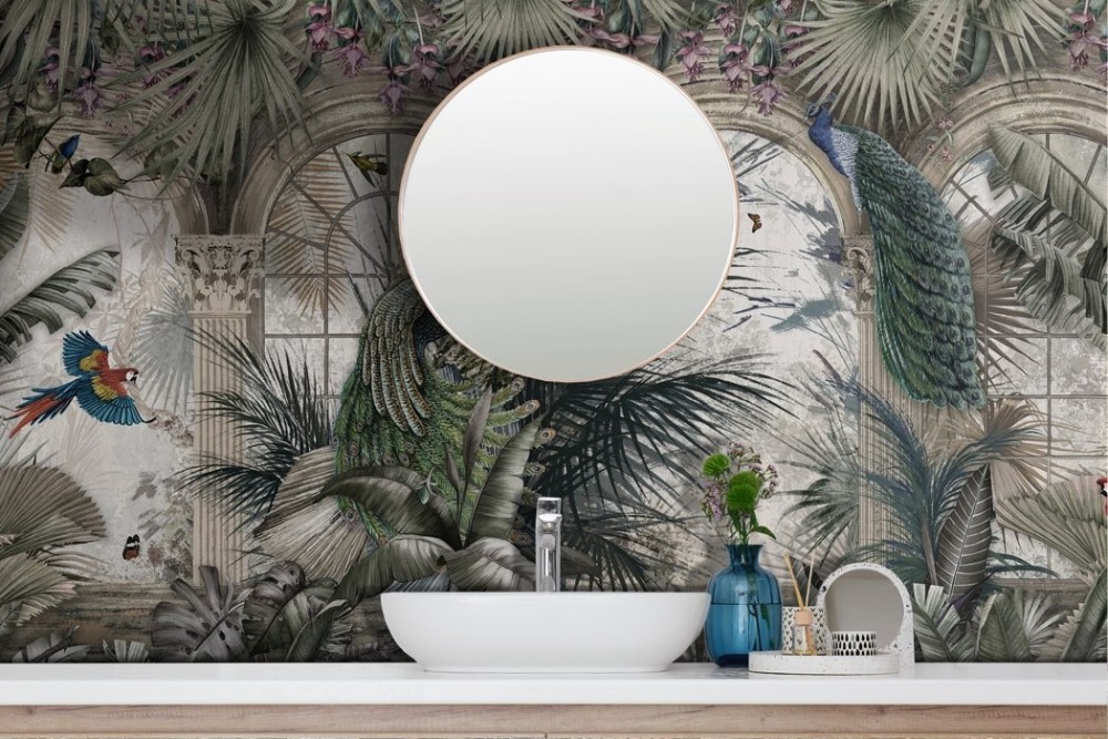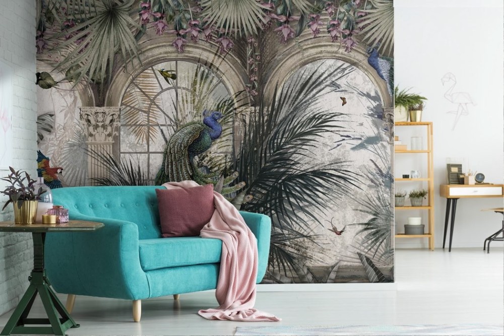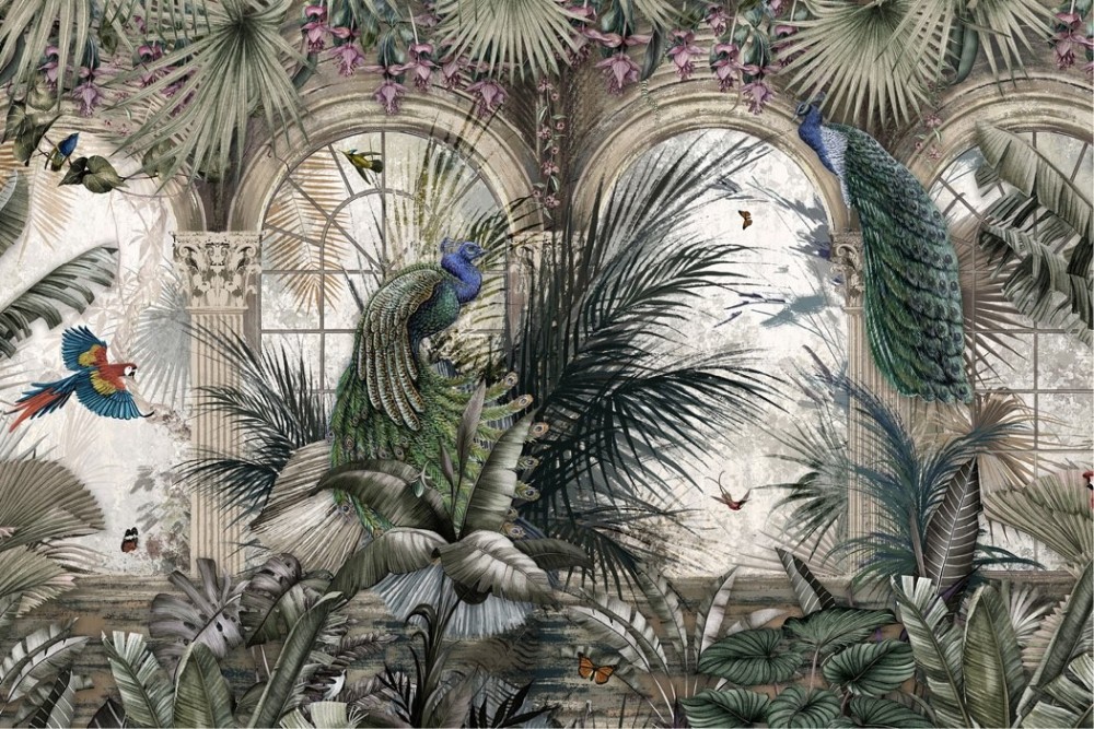 Carta da Parati foglie tropicali con pavoni e pappagalli -a255