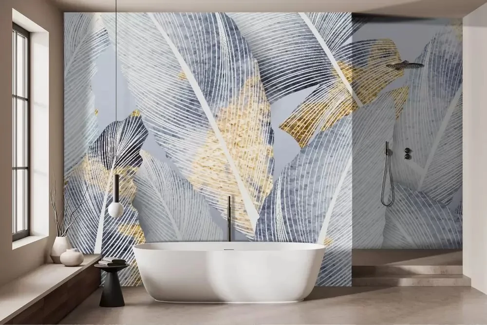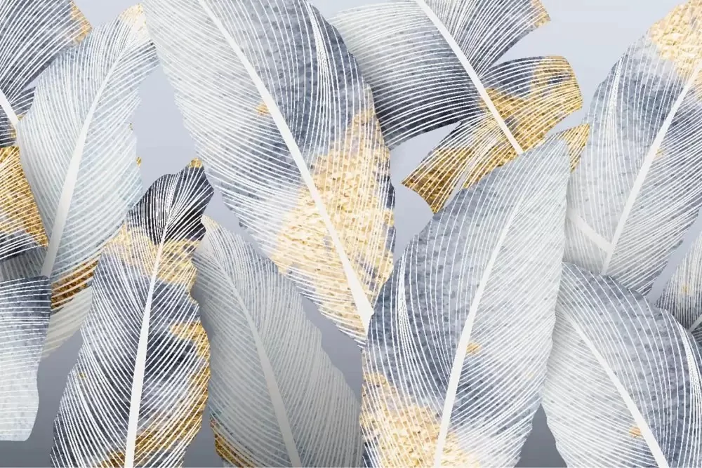 Carta da parati piume blu dorate, scenografica e di carattere. Ideale per camere da letto. Personalizzabile su misura.