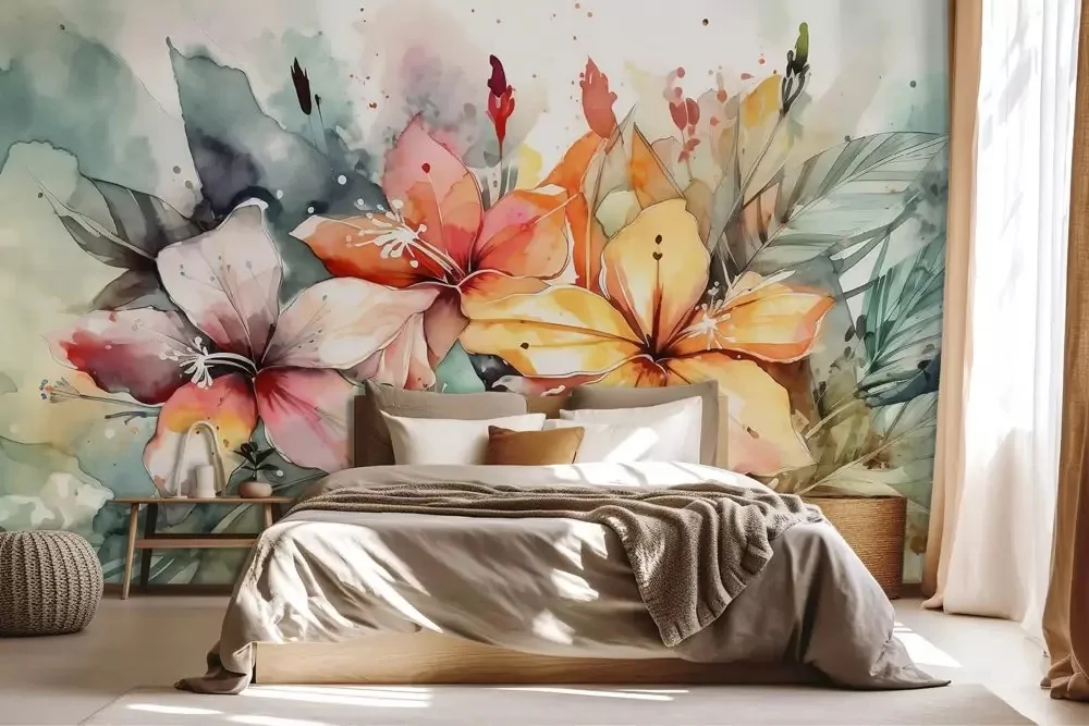 Carta da parati fiori vivaci acquerello, scenografica e di carattere. Ideale per camere e zone relax. Personalizzabile su misura.