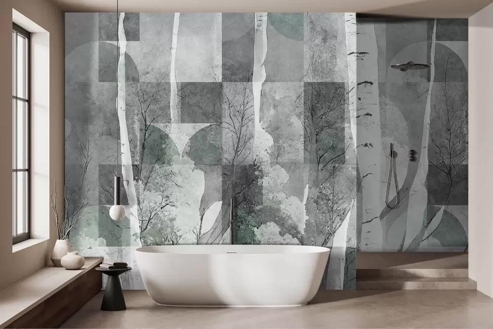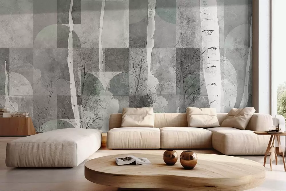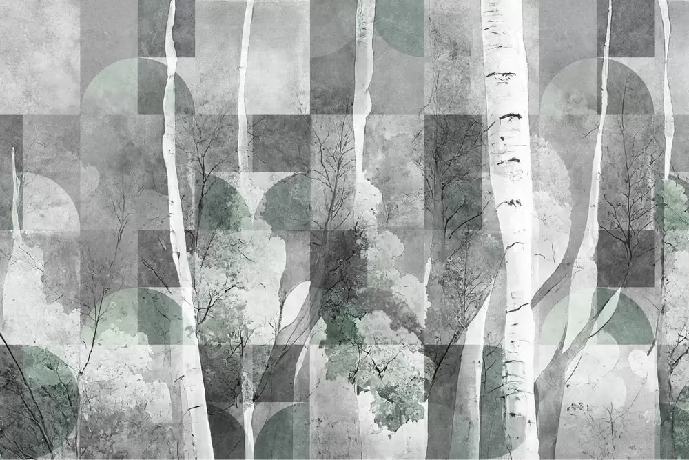 Carta da parati foresta grigia astratta con motivi geometrici , morbida e rilassante. Ideale per zone notte e living. Realizzata con materiali sostenibili.