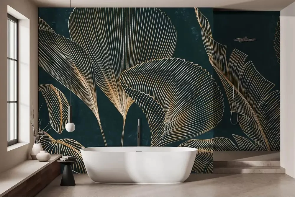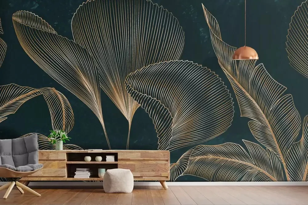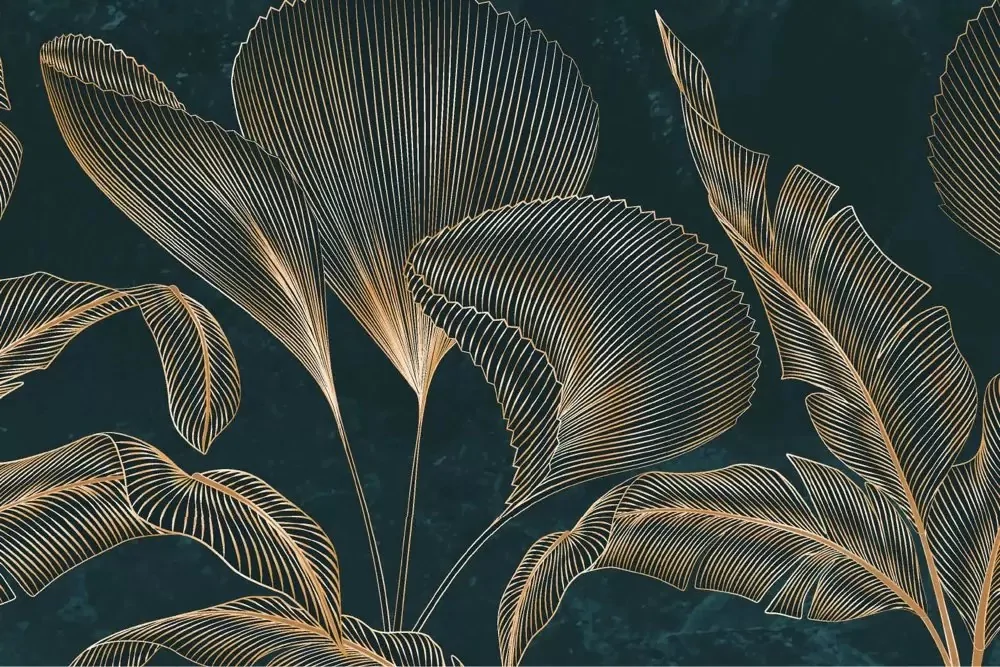 Carta da parati foglie tropicali dorate luxury, delicata e armoniosa. Ideale per soggiorni eleganti. Ecologica e personalizzabile.