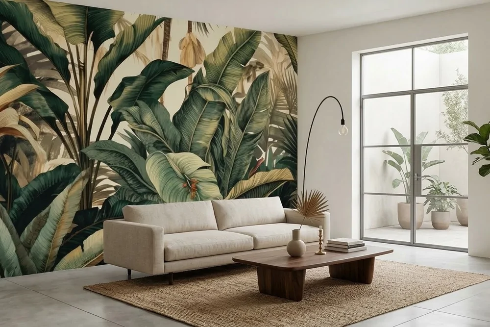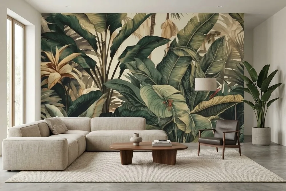 Carta da parati foglie giungla tropicale, morbida e rilassante. Ideale per zone giorno luminose. Realizzata con materiali sostenibili.