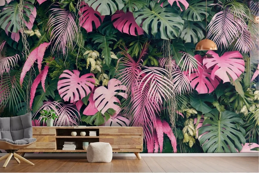 Carta da Parati foglie tropicale verdi e rosa
