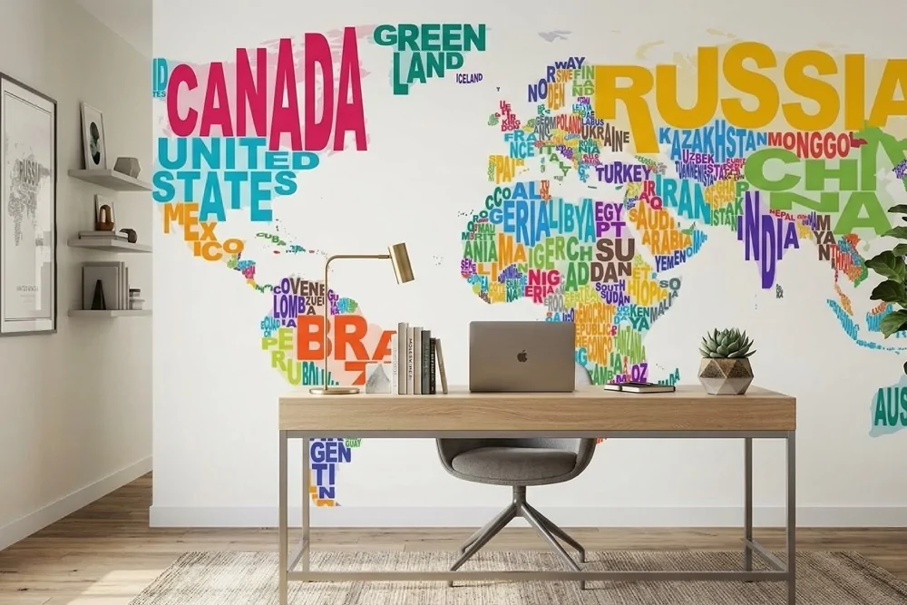 Carta da parati mappamondo colorato nomi nazioni, elegante e luminosa. Ideale per studi e home office. Artigianale italiana.