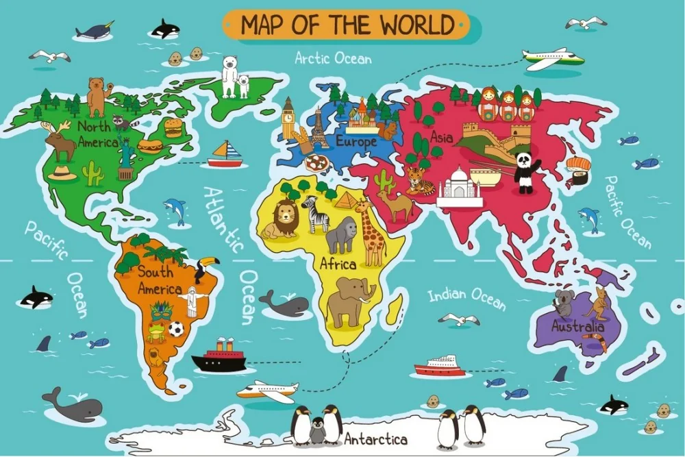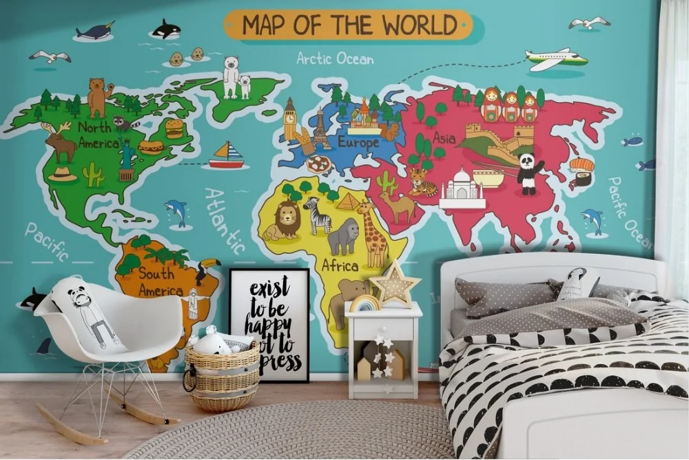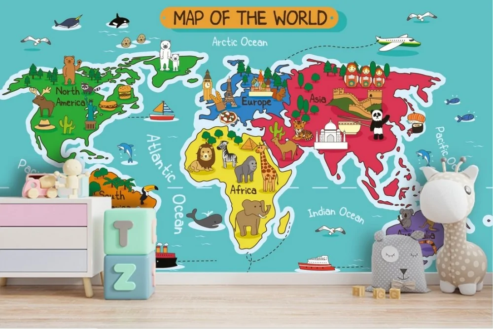 Carta da Parati mappamondo stilizzato animali bambini
