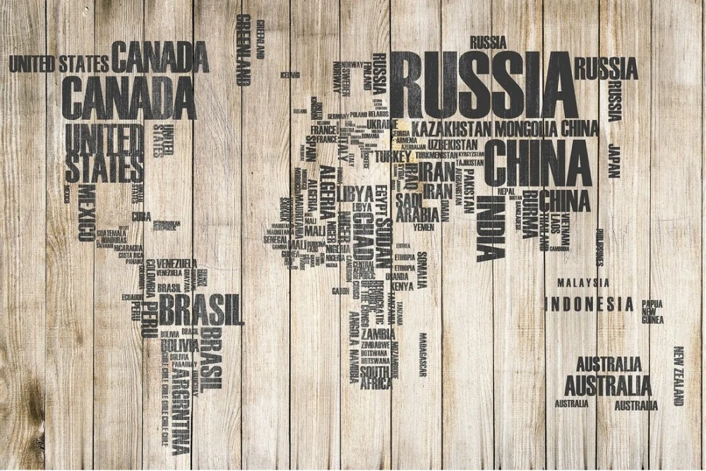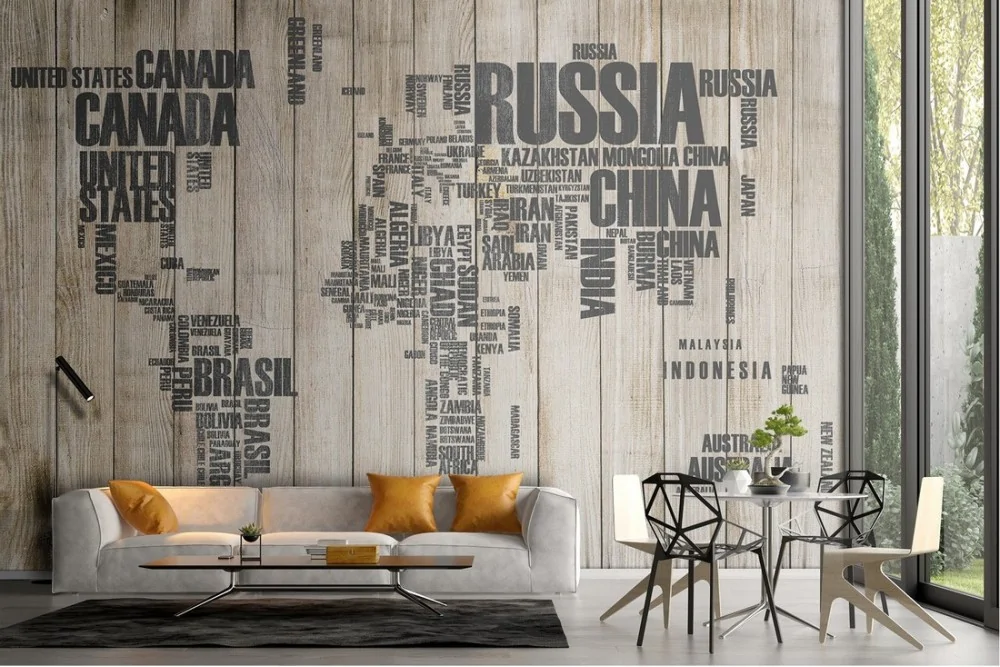 Carta da Parati mappamondo stilizzato scritte stati su legno