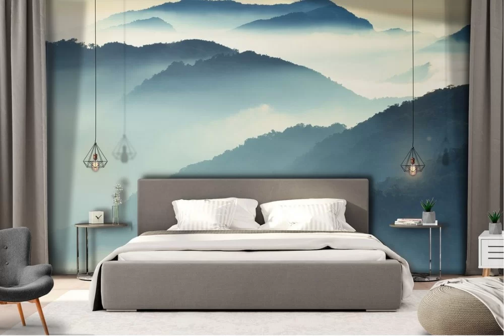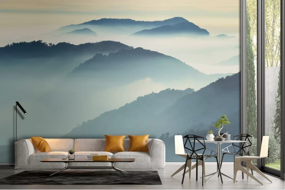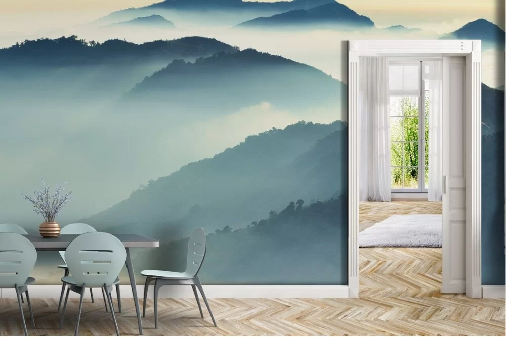 Carta da Parati paesaggio montagne con alberi nella nebbia