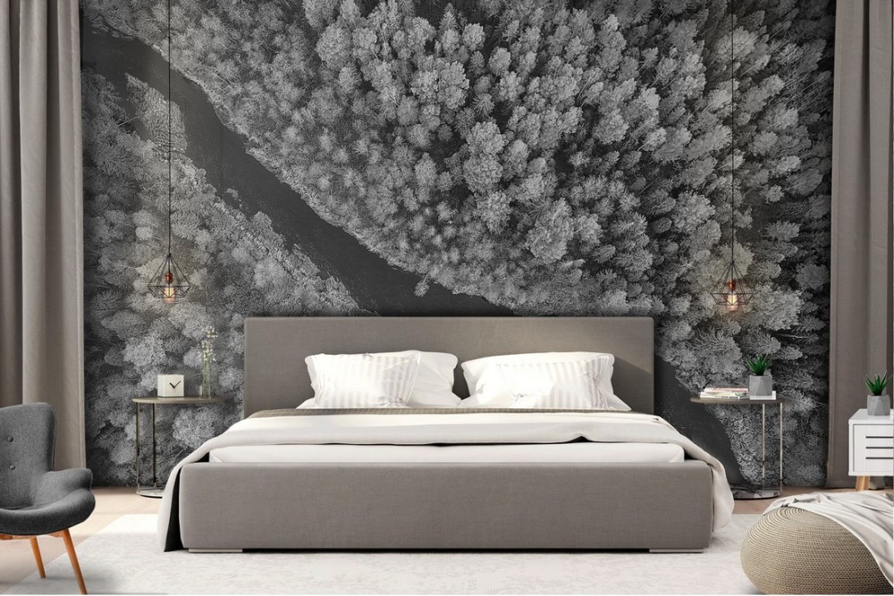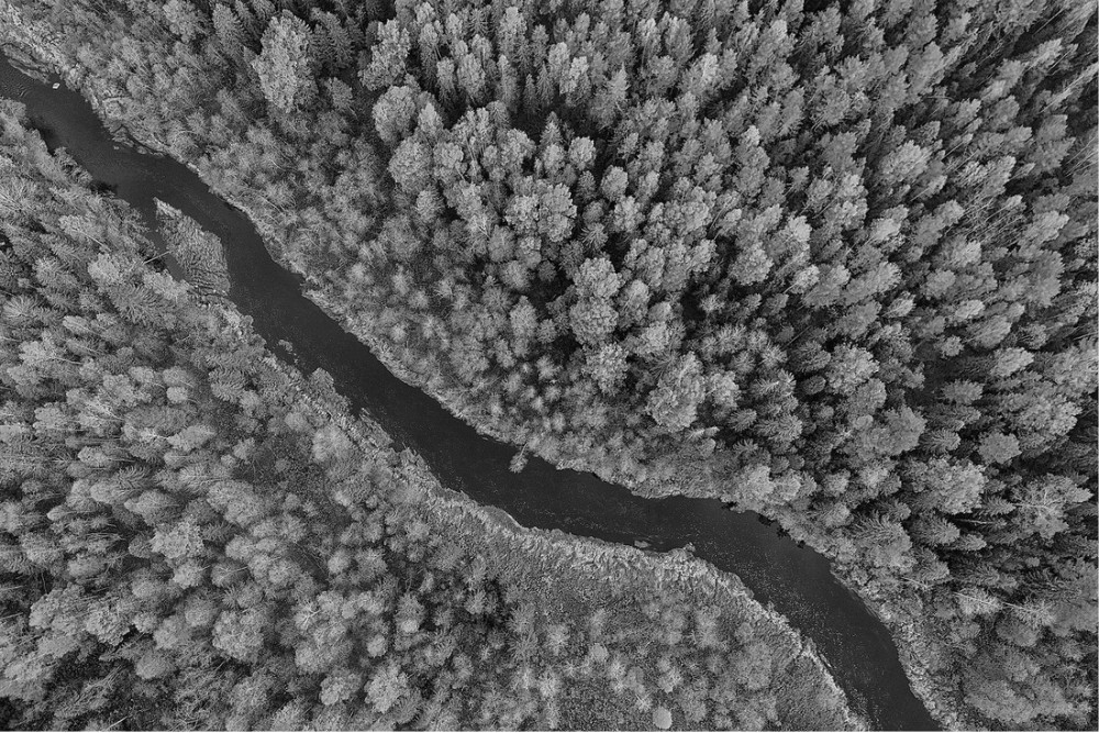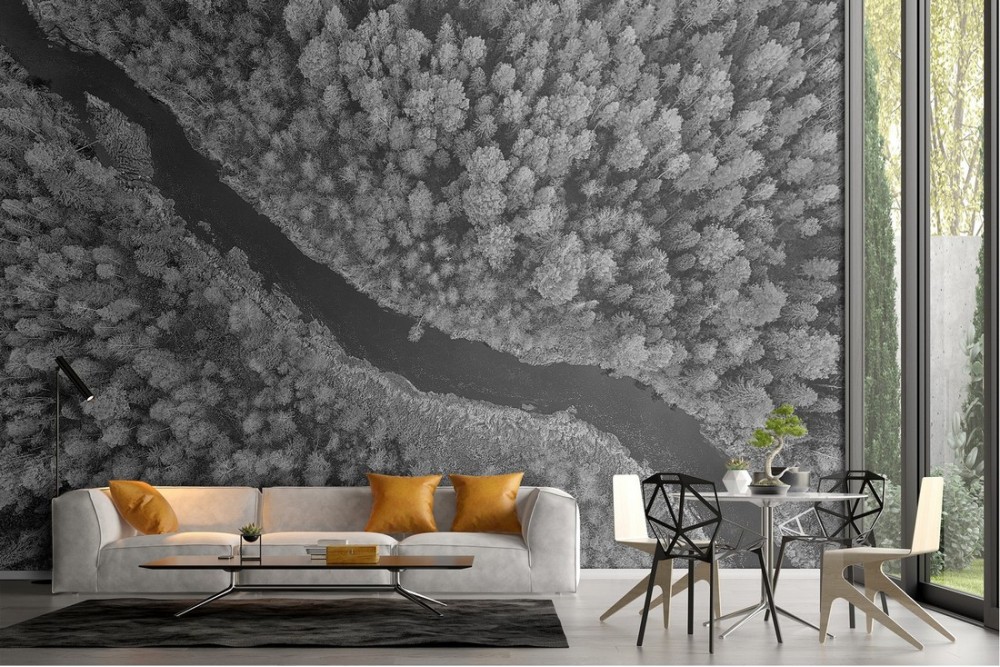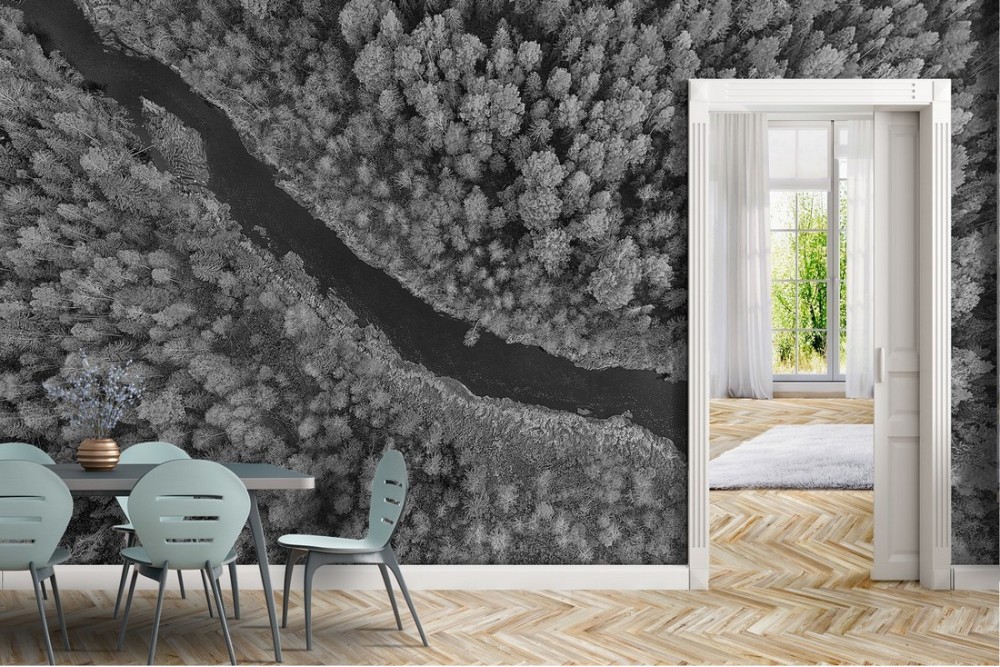 Carta da Parati fiume nel bosco paesaggio bianco e nero
