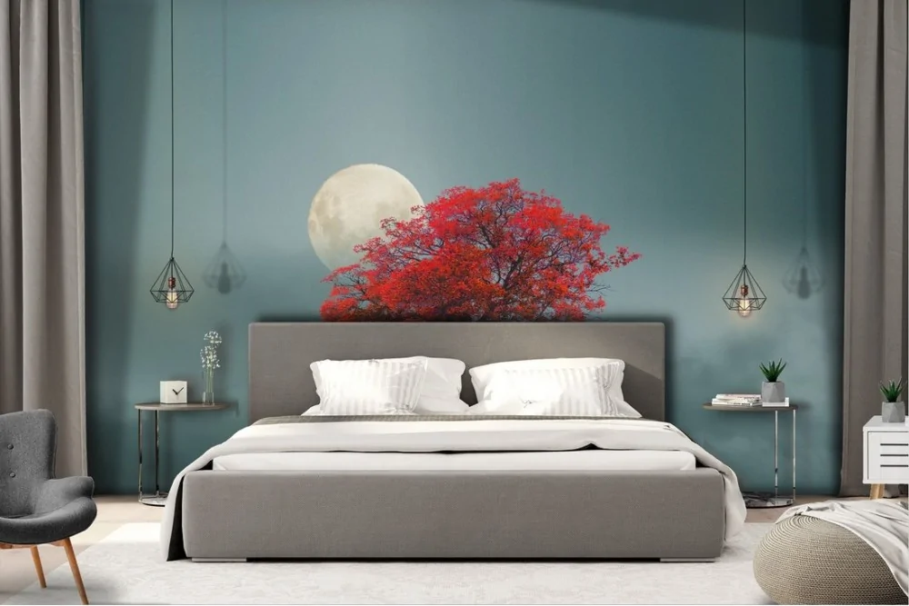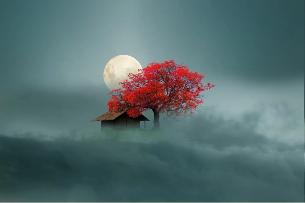 Carta da Parati albero e casa tra le nuvole paesaggio astratto