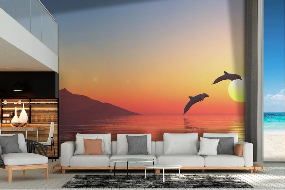 Carta da Parati mare con delfini paesaggio tramonto alba