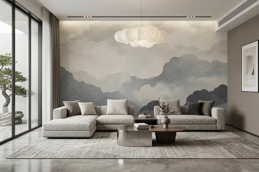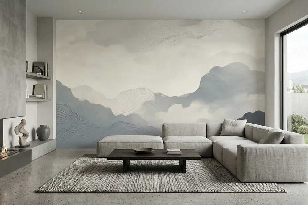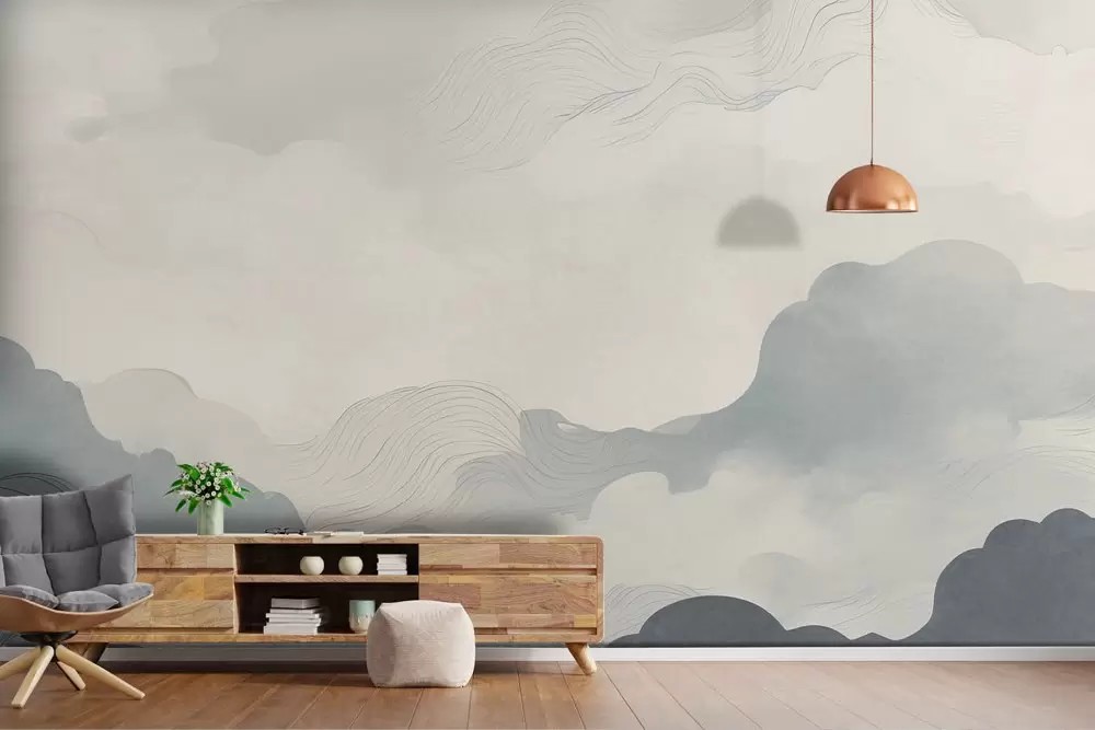 Carta da parati nuvole pastello, morbida e rilassante. Ideale per ambienti moderni. Realizzata con materiali sostenibili.