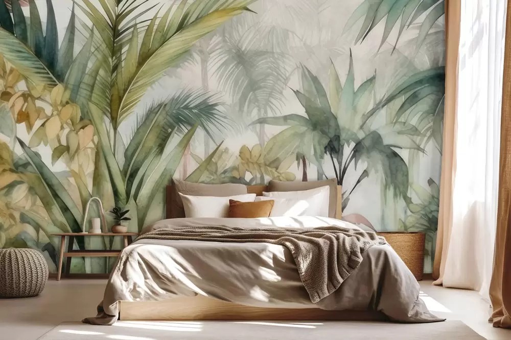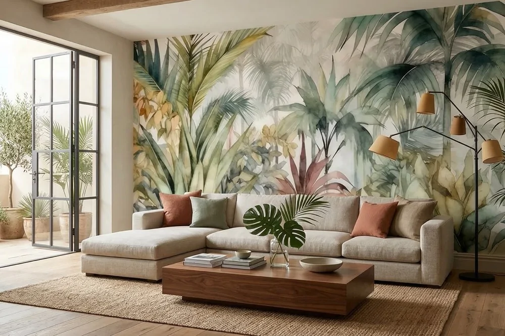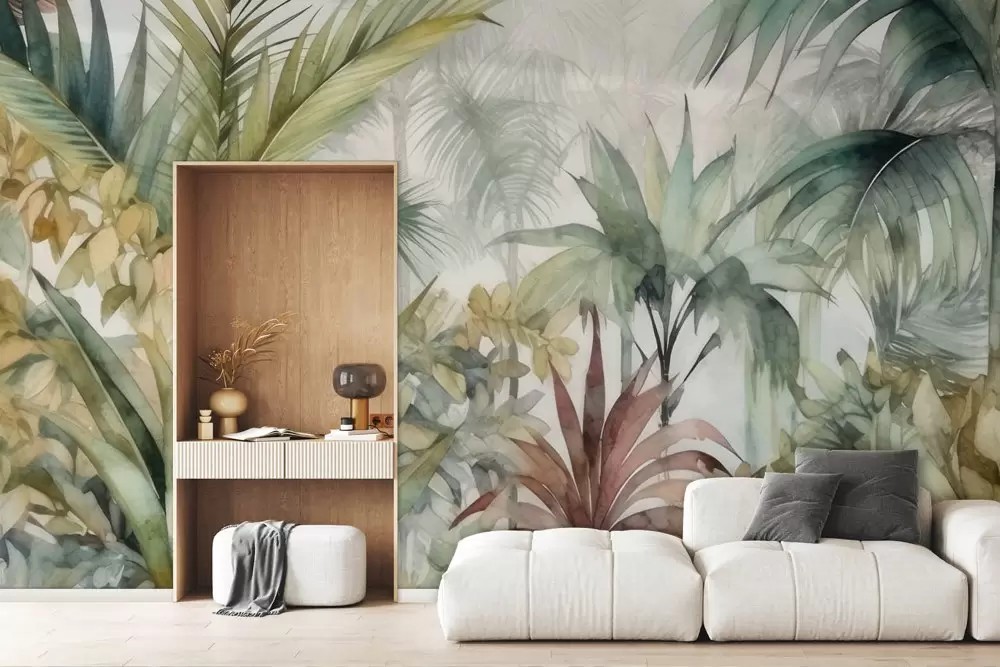 Carta da parati paesaggio giungla acquerello, materica e avvolgente. Ideale per zone giorno luminose. Inchiostri a base d’acqua, atossici.